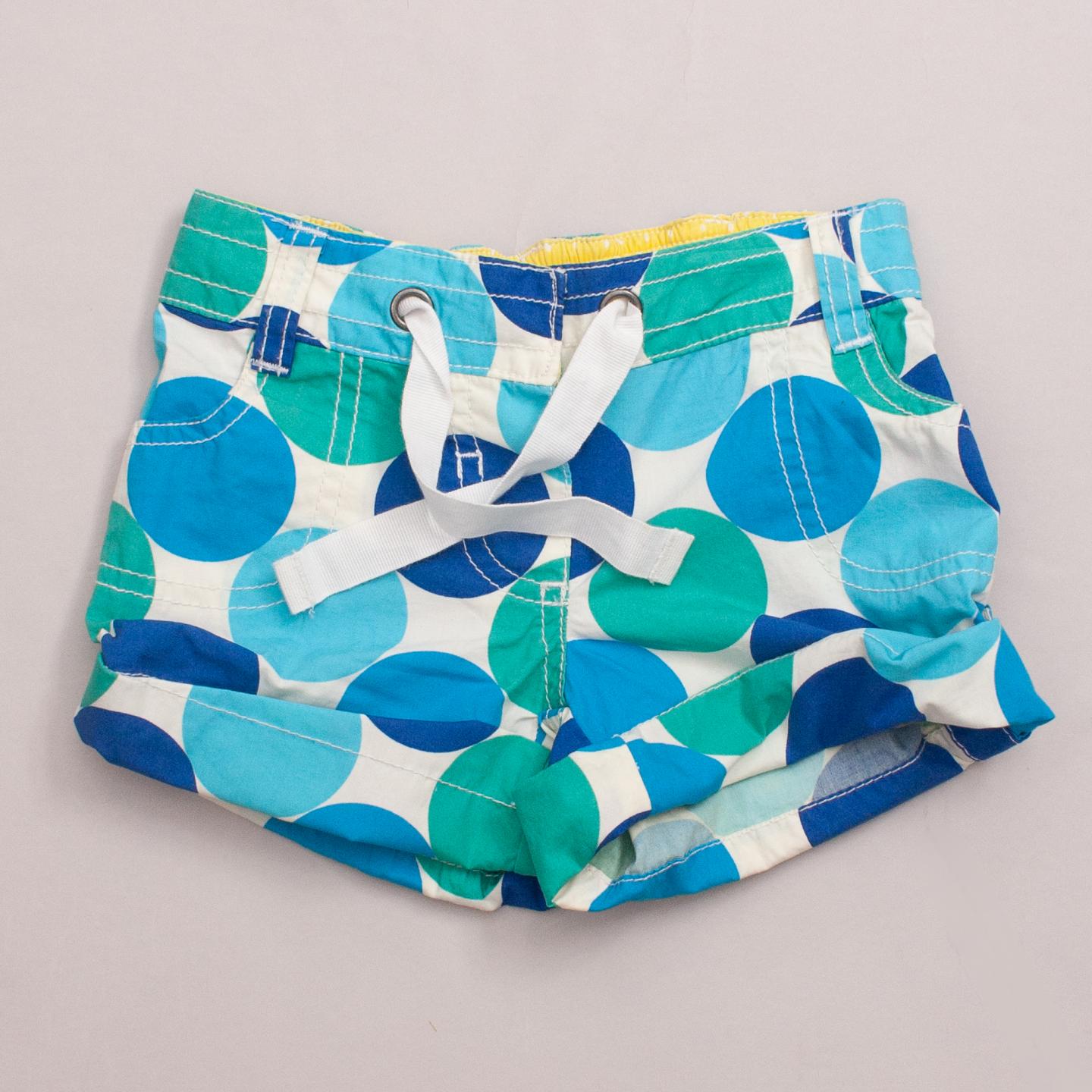Mini Boden blue and teal polka dot patterned shorts with rolled cuffs, front and back pockets, belt loops and elastic waistband with drawstring - 100% Cotton