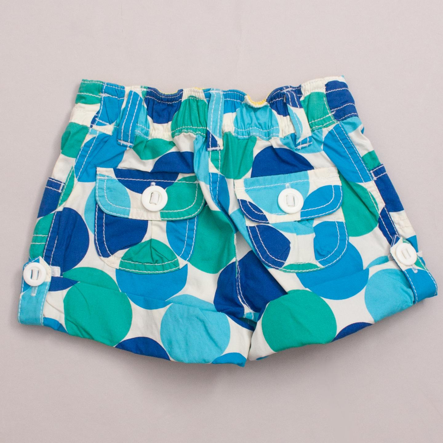Mini Boden blue and teal polka dot patterned shorts with rolled cuffs, front and back pockets, belt loops and elastic waistband with drawstring - 100% Cotton
