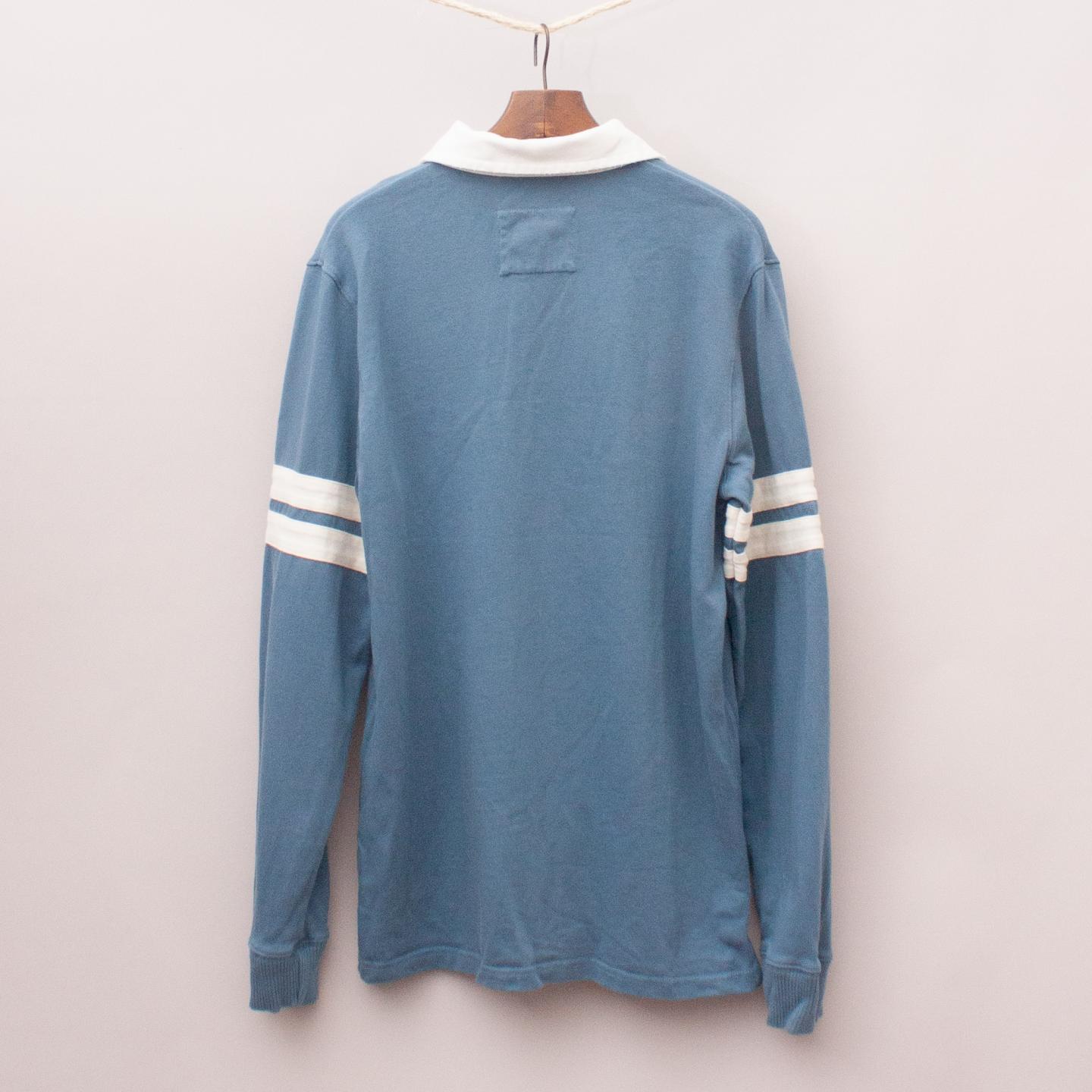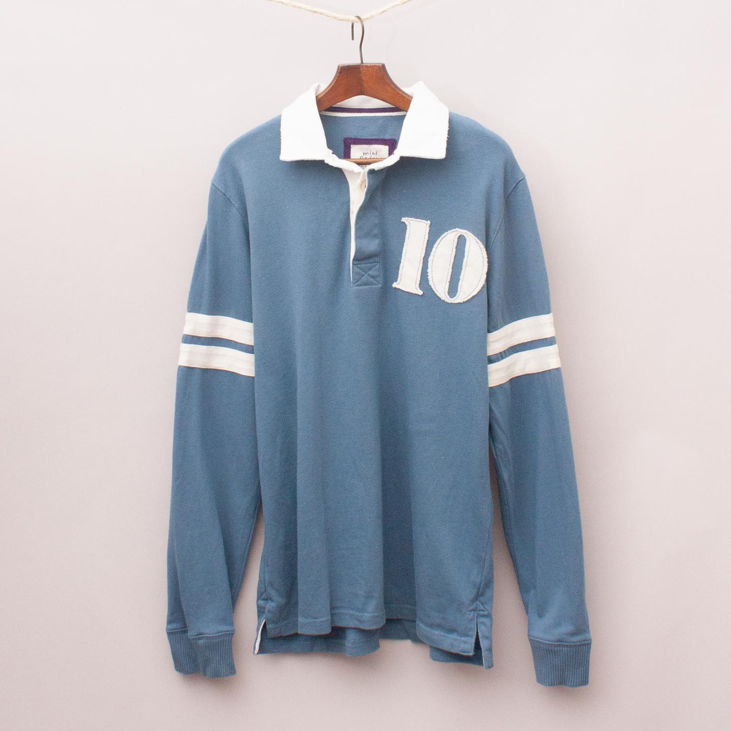 Mini Boden blue and white rugby style jumper with white stripe detail on the sleeves and embroidered '10' on the front *100% Cotton