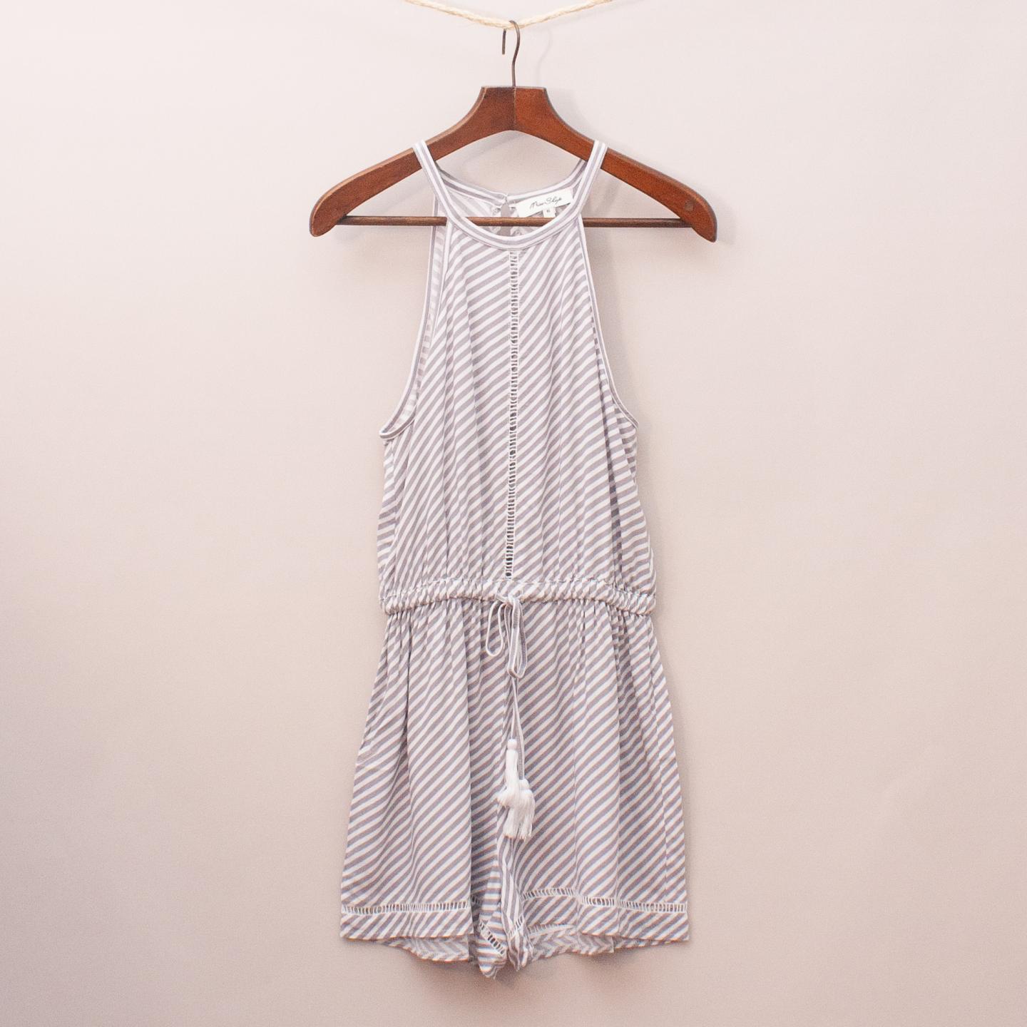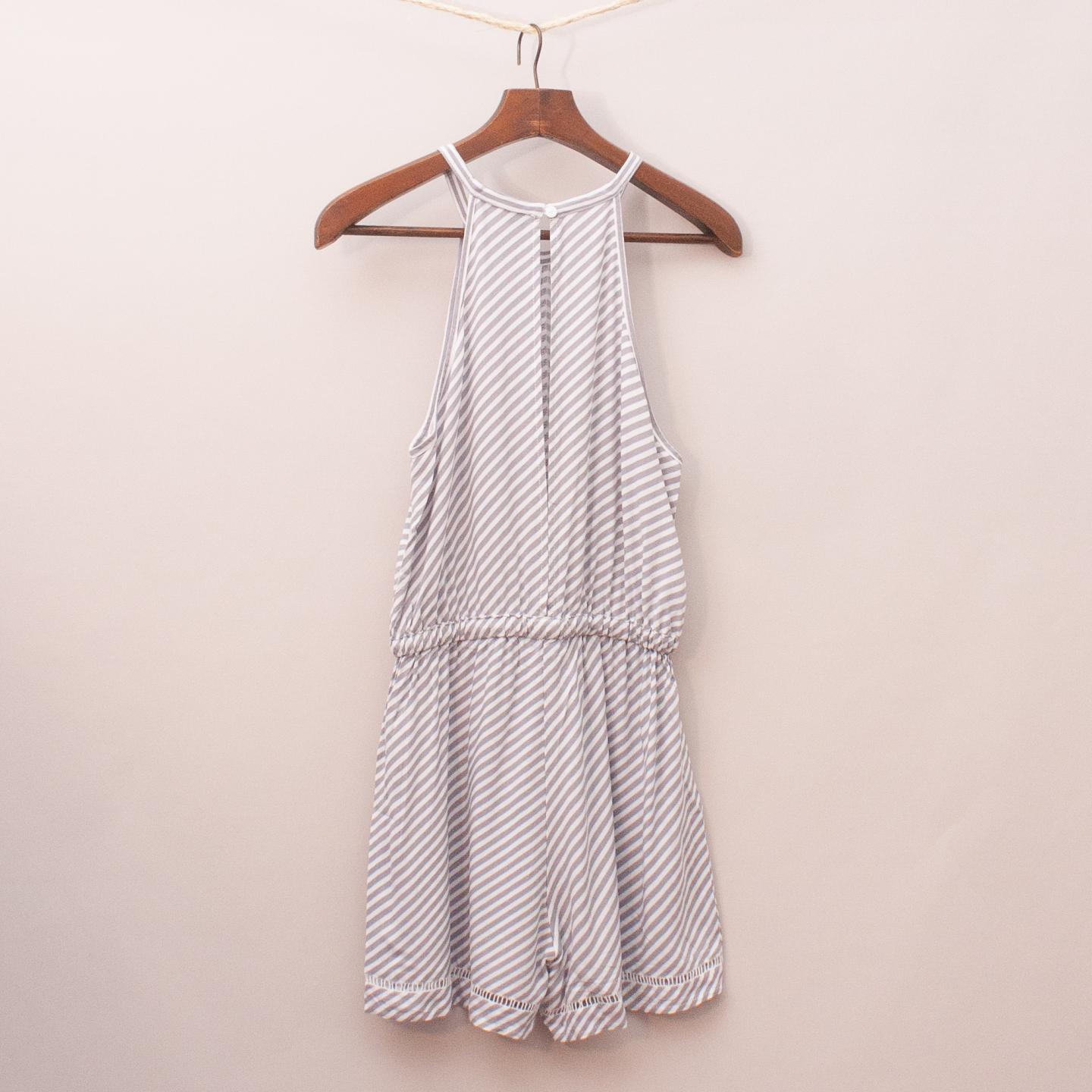 Miss Shop grey and white striped playsuit with elastic waistband, tassel drawstring and single button back closure - Marked as women's size 6 *100% Viscose