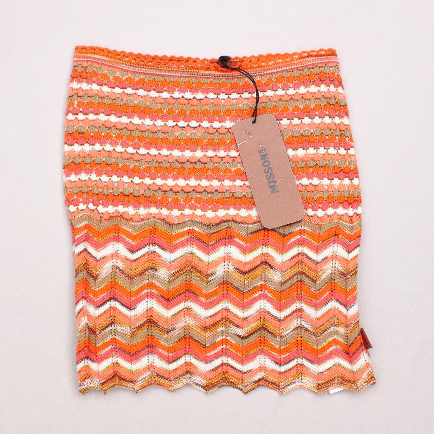 Missoni Kids knitted orange, pink, cream and khaki patterned stretch skirt with zig zag hemline and elastic scalloped waistband