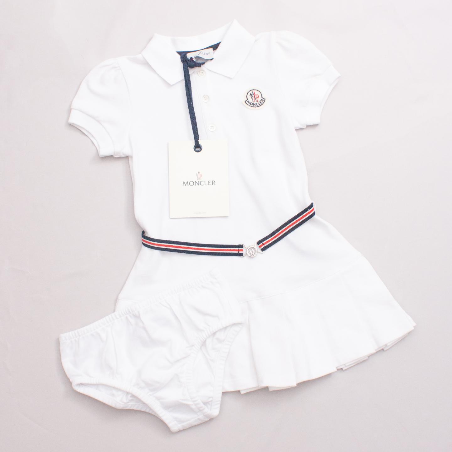 Moncler "brand new with tags" white polo style tennis dress with pleated skirt, red and white stripe belt detail and matching white bloomers