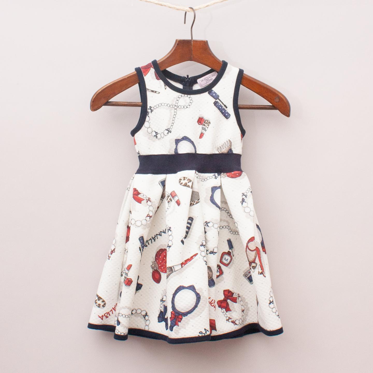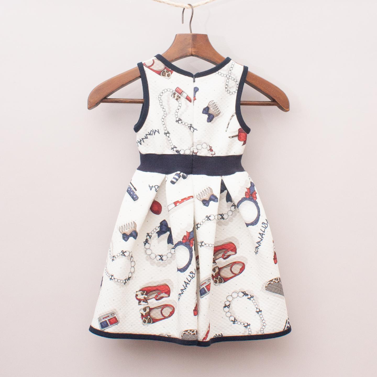 Monnalisa textured and patterned dress with stiff pleated skirt, navy blue trim and elastic waistband with zip back closure *100% Polyester