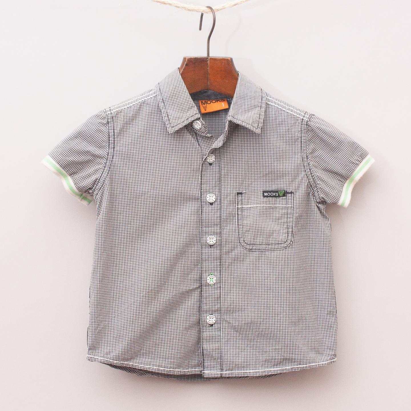 Mooks black and white check shirt with single front pocket, white and green sleeve trim and full button down front *100% Cotton