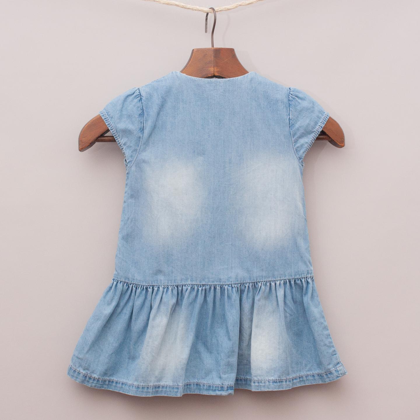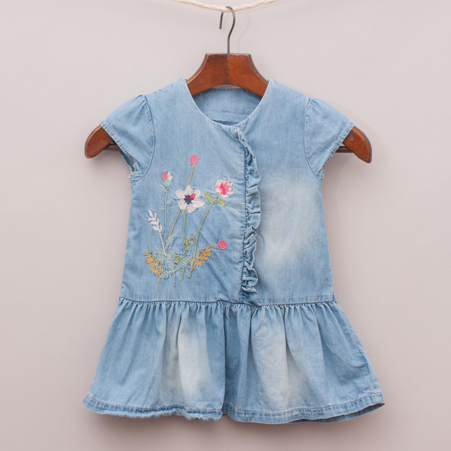 Mothercare distressed denim dress with embroidered flowers on the front, ruffled skirt and ruffle button detail with cap sleeves