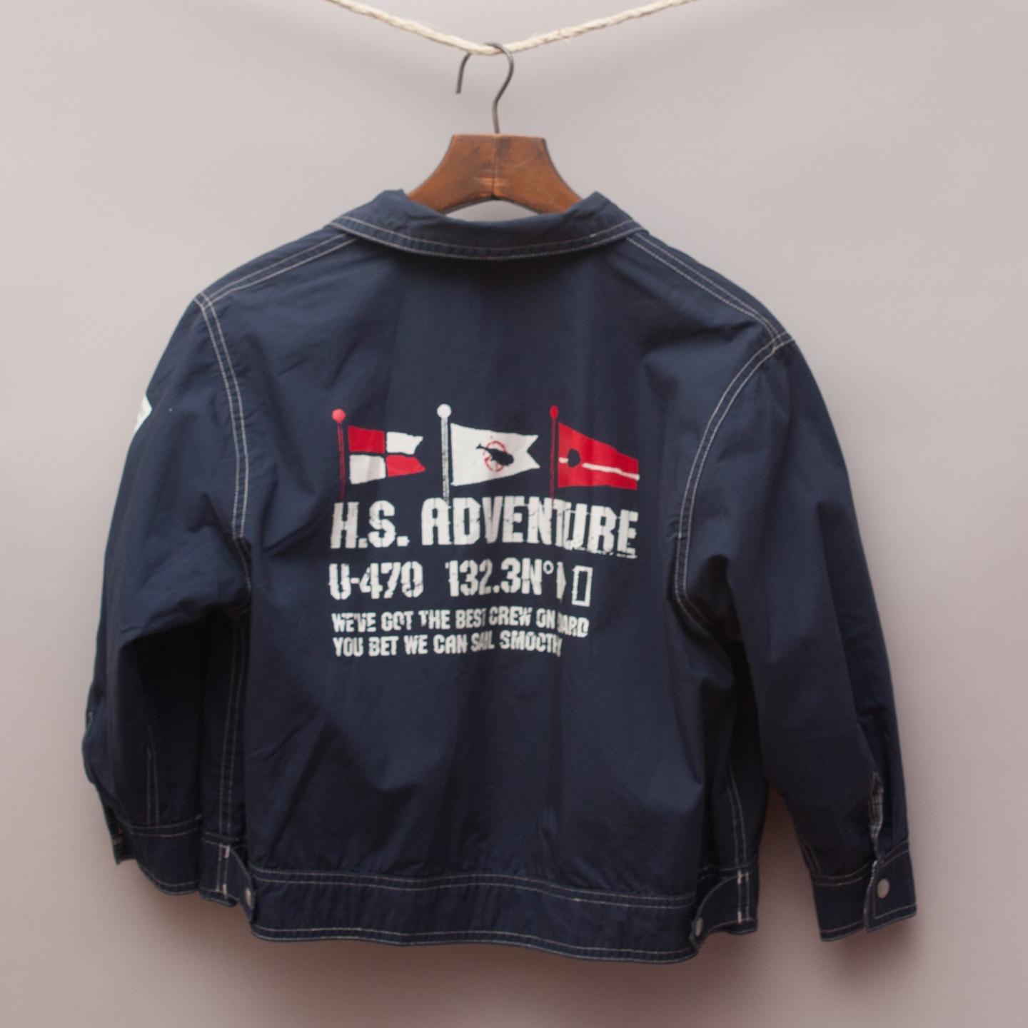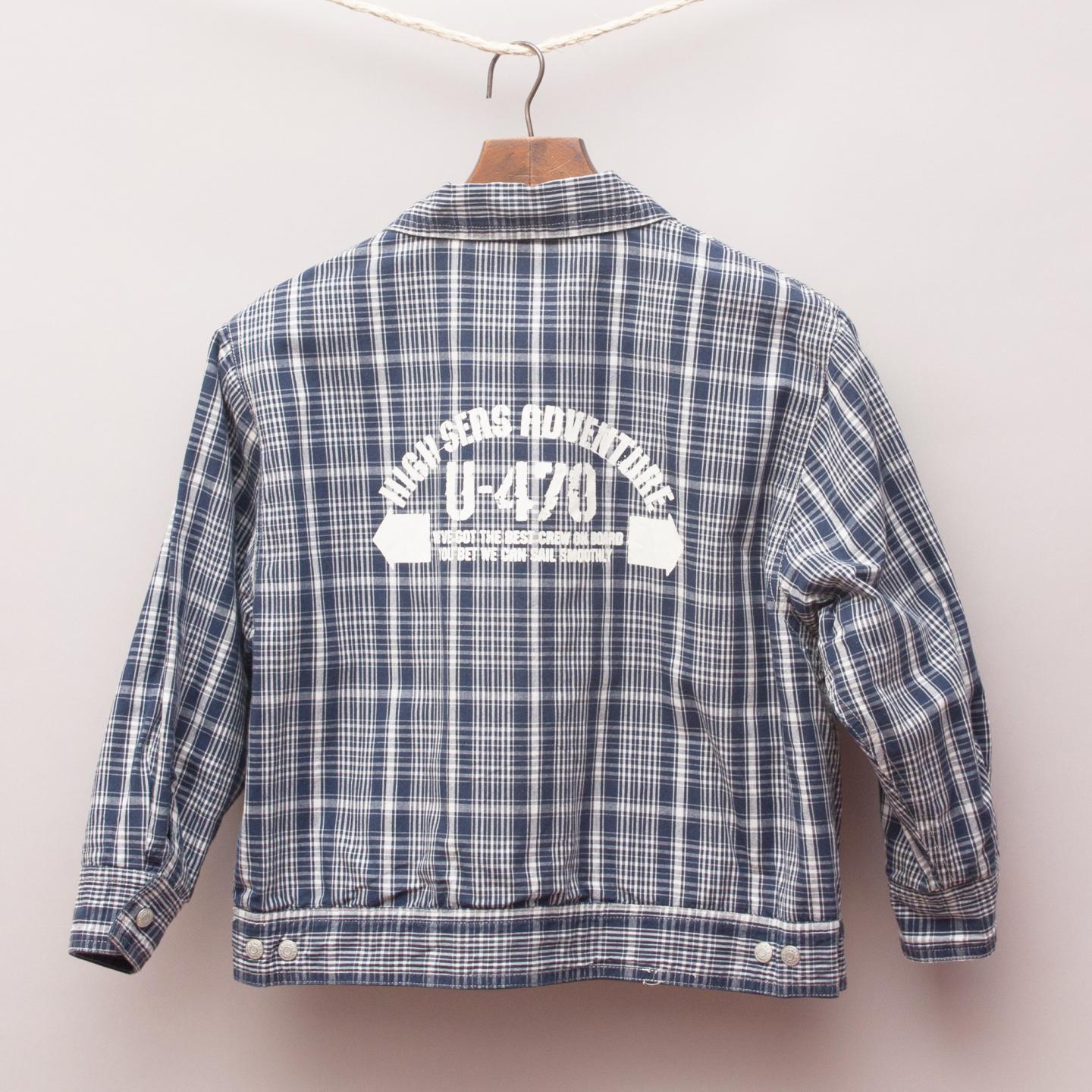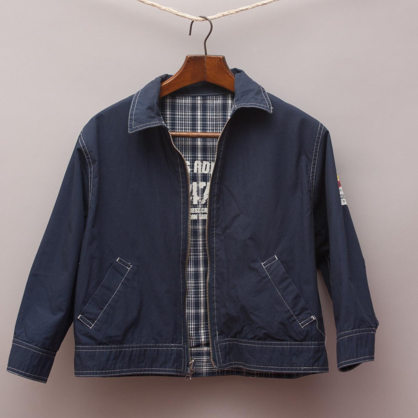 Navy blue and white checked collared bomber jacket with plain navy blue reversible side with printed slogan on the back and full zip up front
