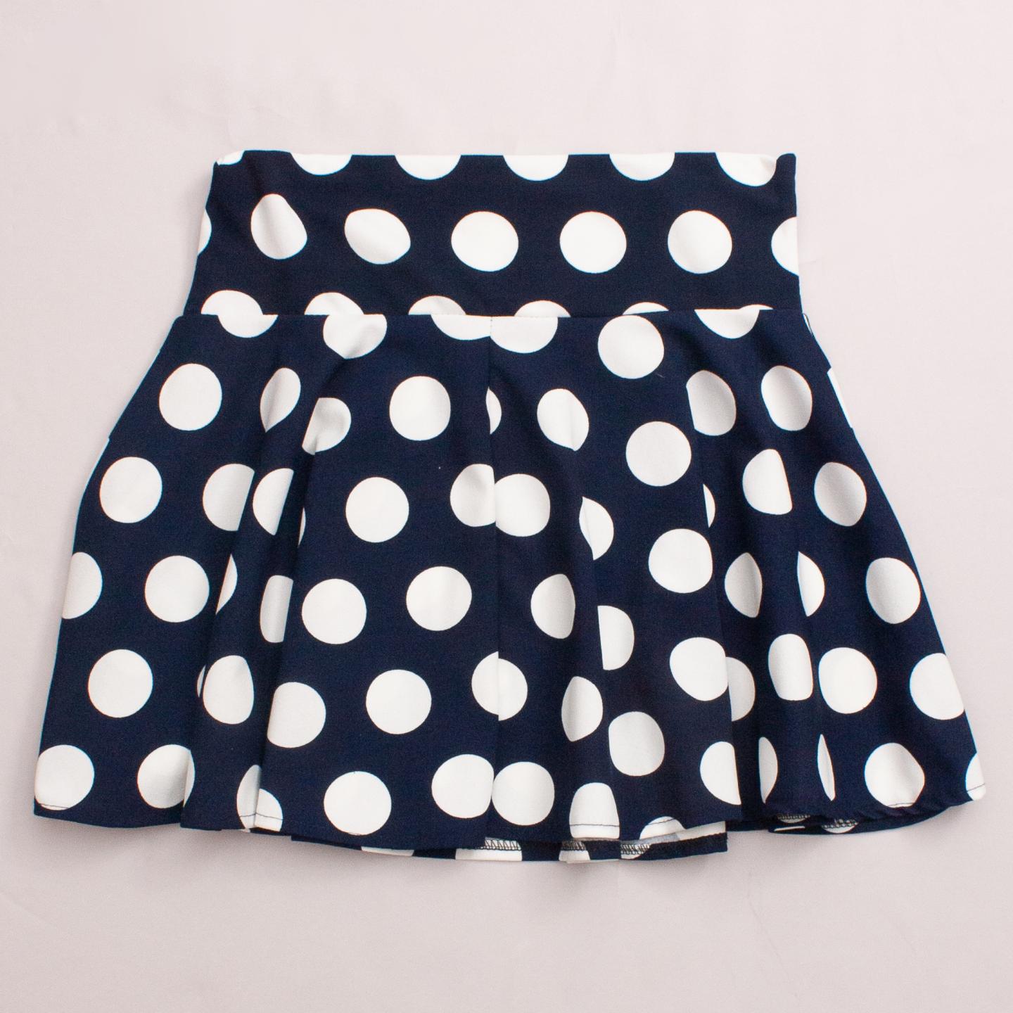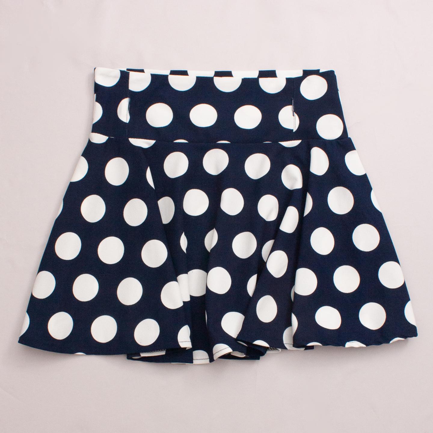 Navy blue and white polka dot skirt with flippy style, wide waistband and simply slips on