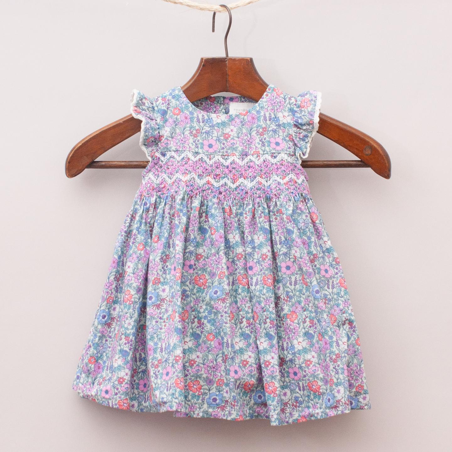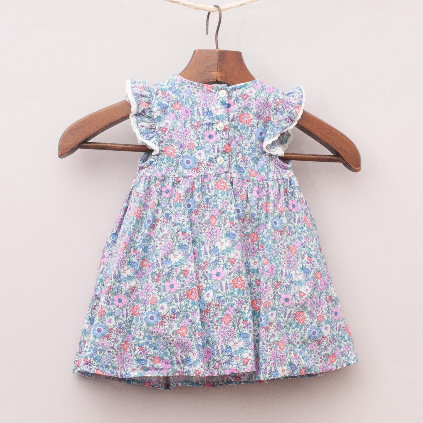 Next pink and blue floral patterned dress with ruffle sleeves, ruched and embroidered front, gathered skirt and fully lined with button back closure *100% Cotton