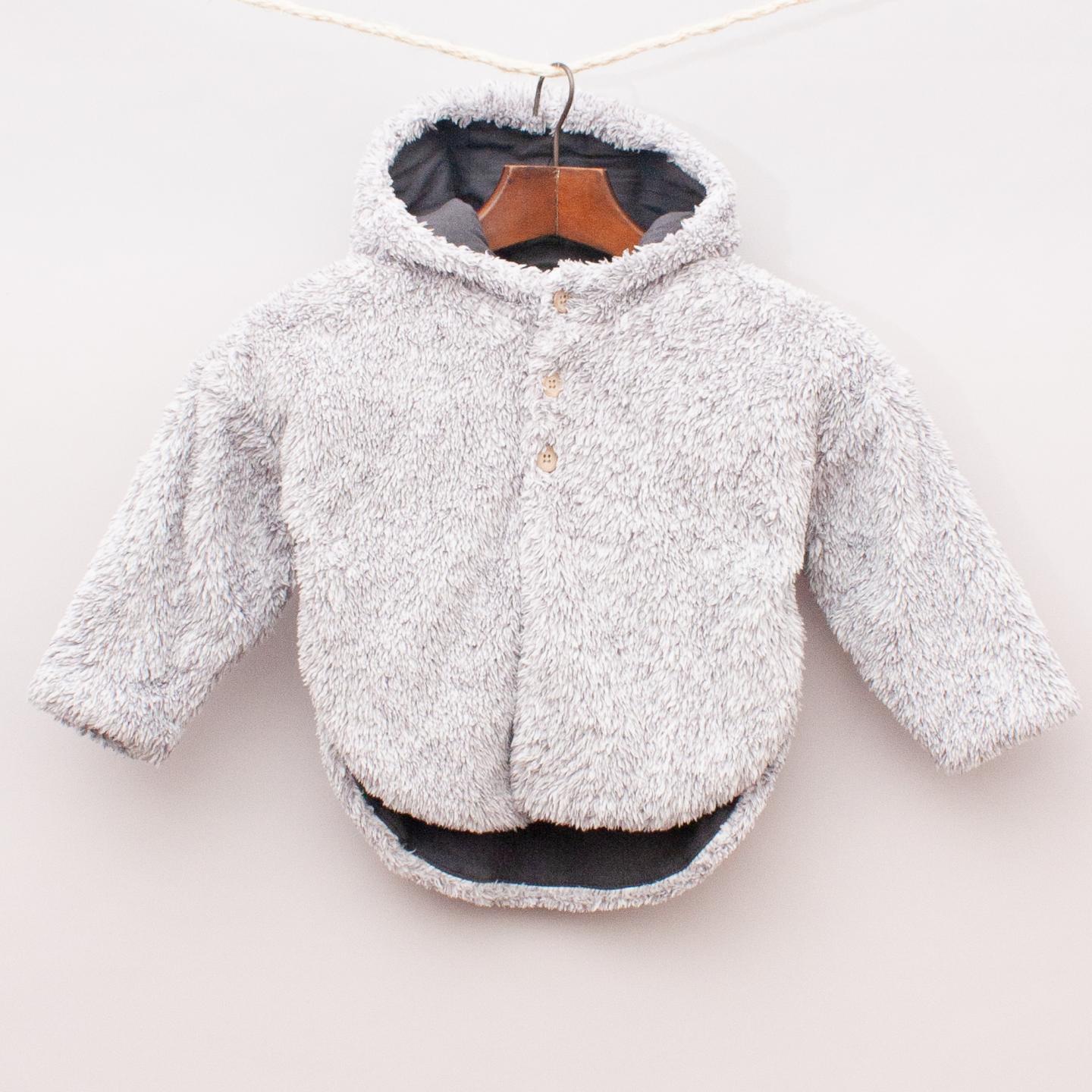 Next grey fuzzy cardigan with hood, rounded hemline and three button closures