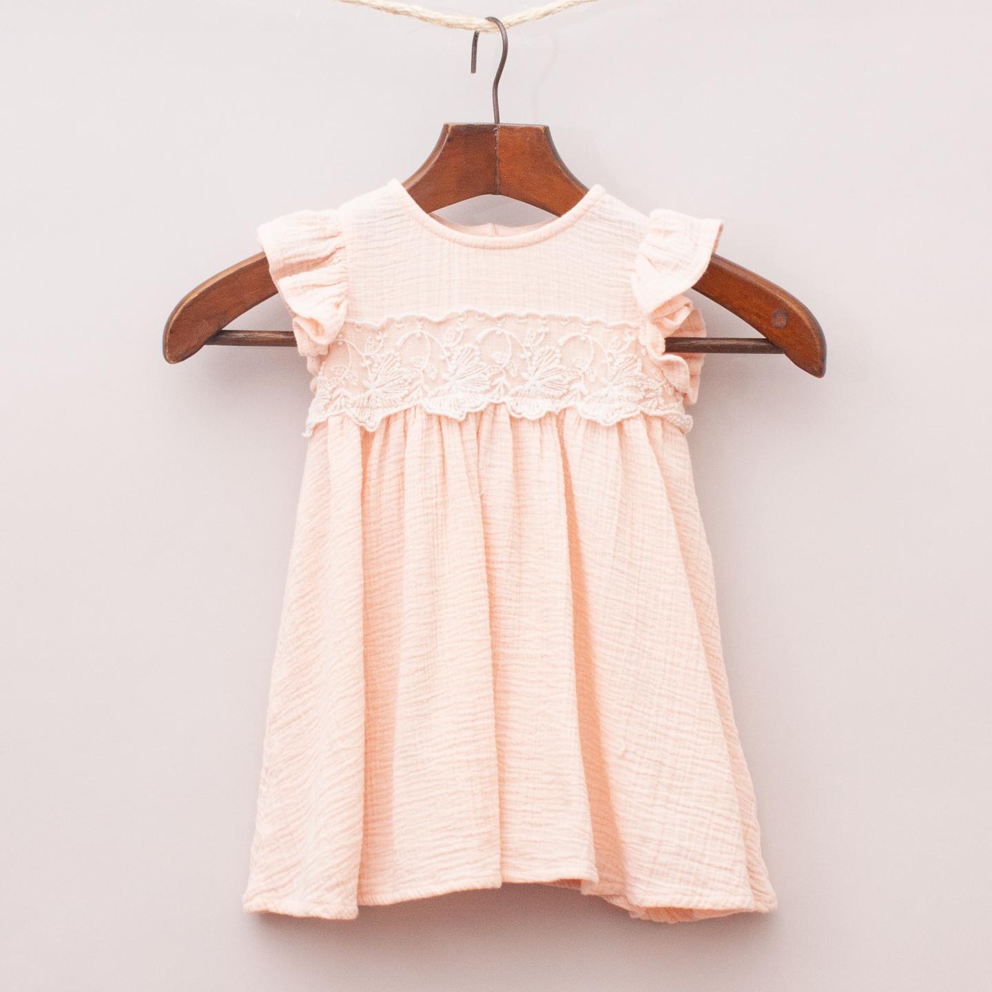 Next peach coloured dress with ruffle sleeves, gathered skirt, lace detailing across the front and button back closure *100% Cotton