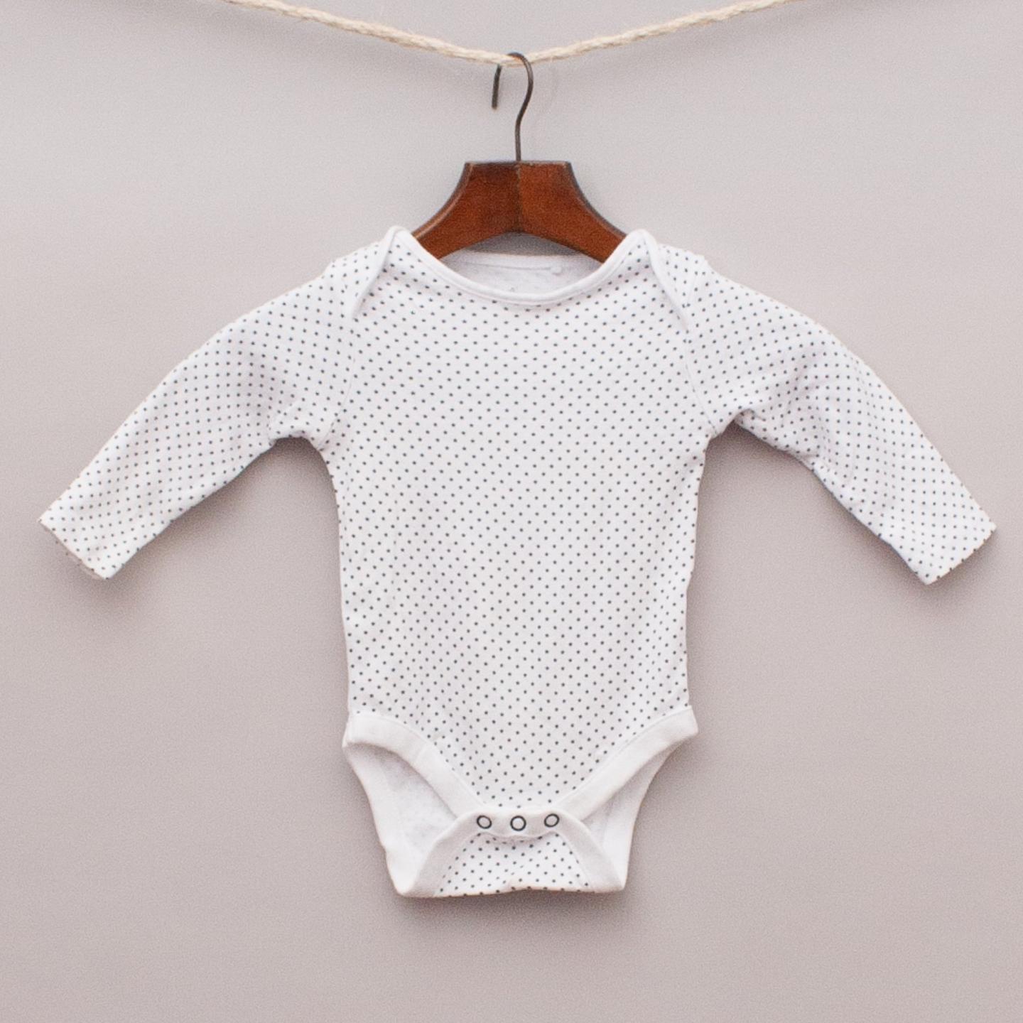 Next white long sleeve romper with navy blue star pattern throughout and snap button closures