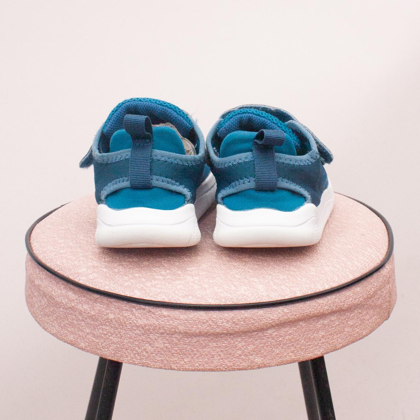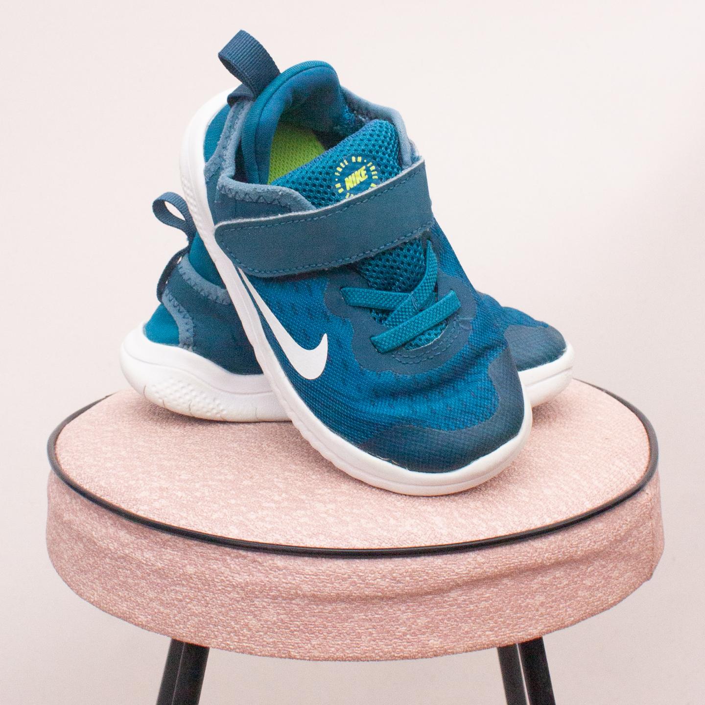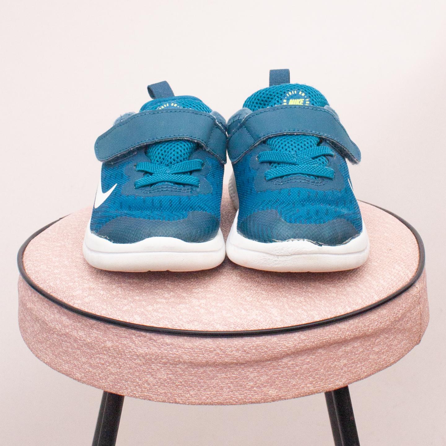 Nike blue and white free run runners with sturdy rubber soles and single velcro strap - Size EU 28 (Age 4 approx.)