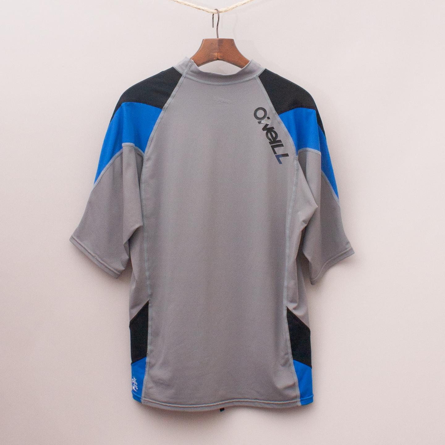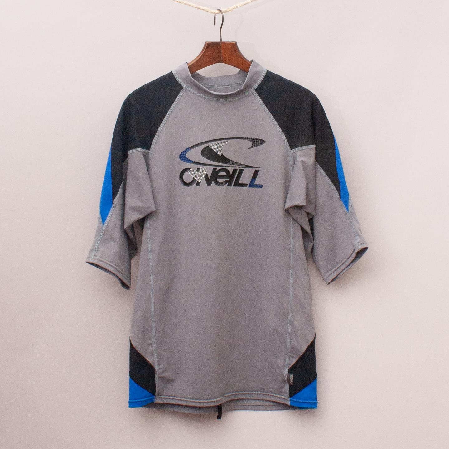 O'Neill grey and black rash vest with printed logo across the front and 50+ U.V. block *91% Nylon, 9% Spandex
