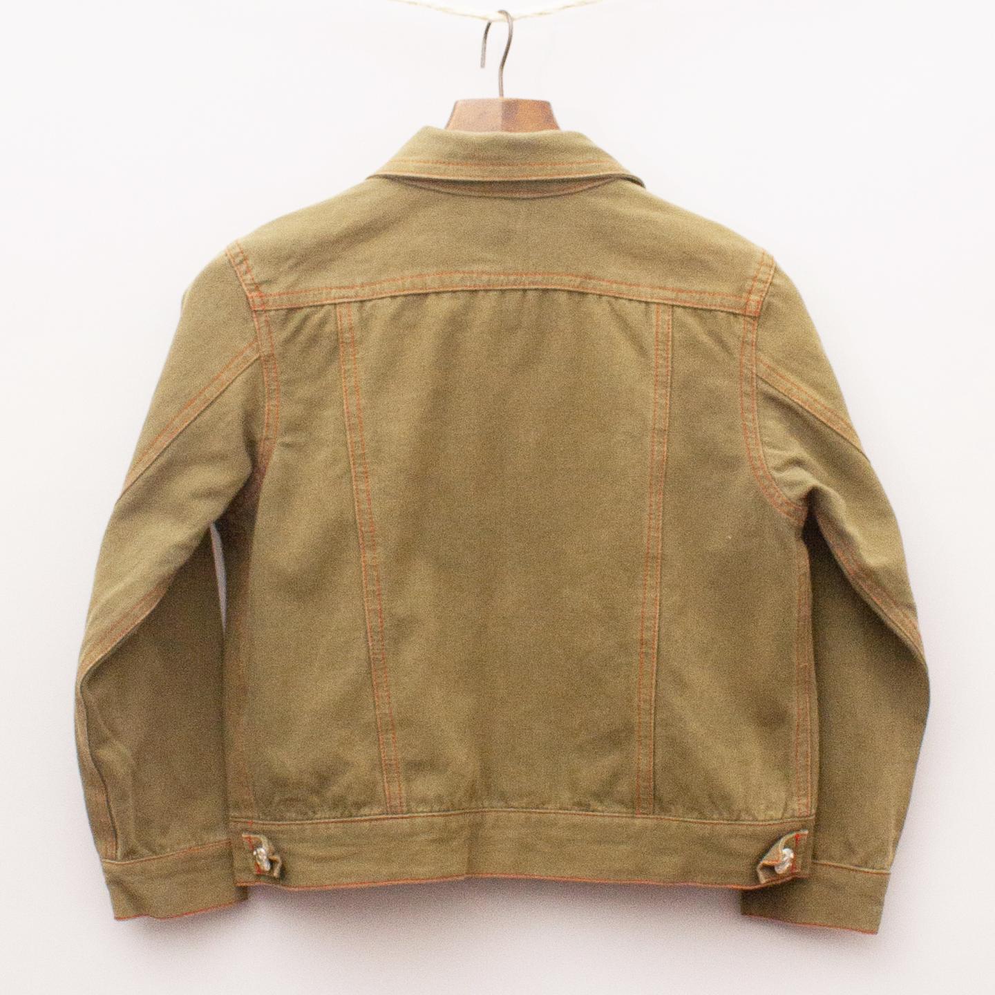 Oblong khaki denim jacket with red stitching detail, multiple front pockets and full button down front