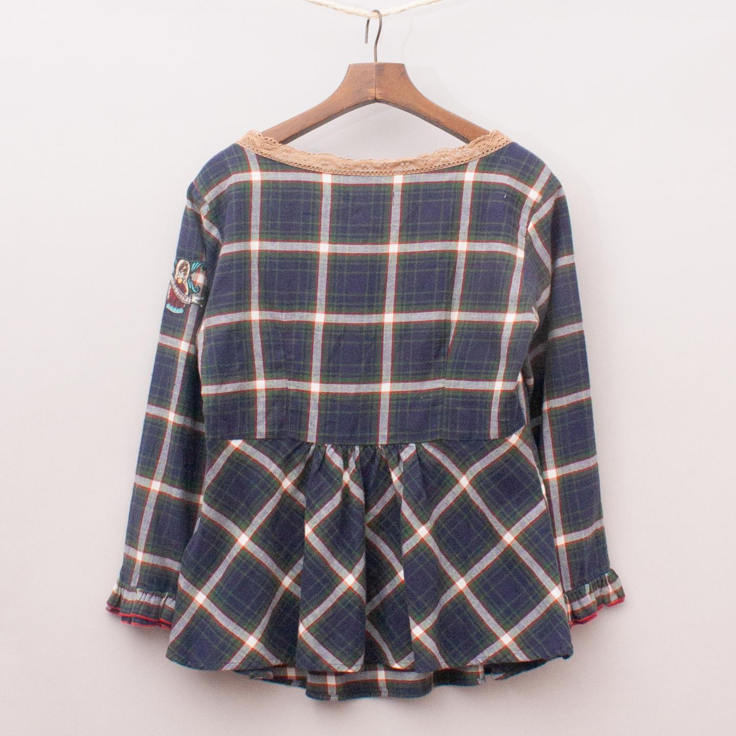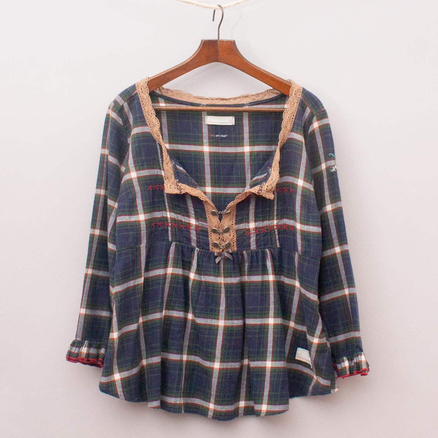 Odd Molly green, white and red plaid shirt with gathered waistband and cuffs, lace trim and button down front - Marked as a women's size 1 *100% Cotton