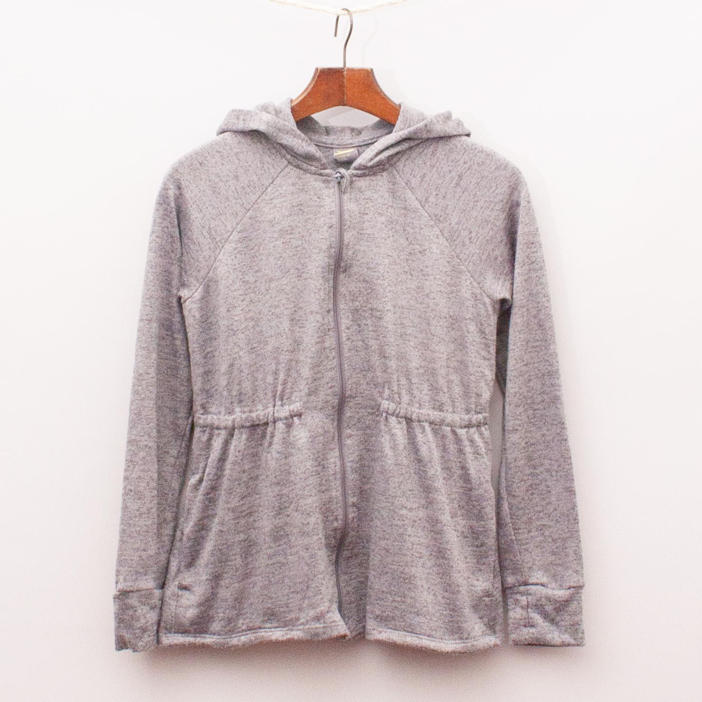 Old Navy grey marle lightweight hooded jumper with elastic cinched in waist, two front pockets and full zip up front
