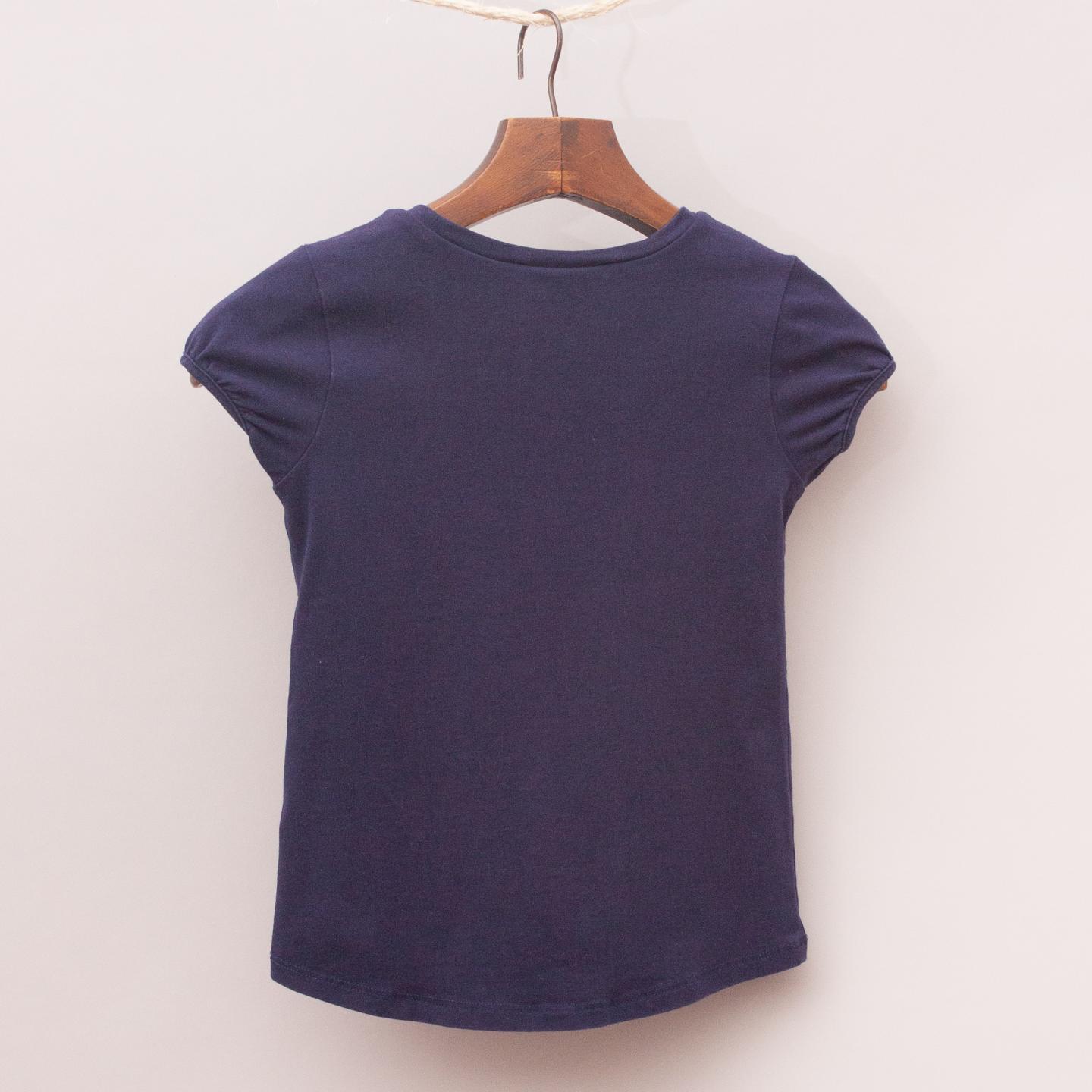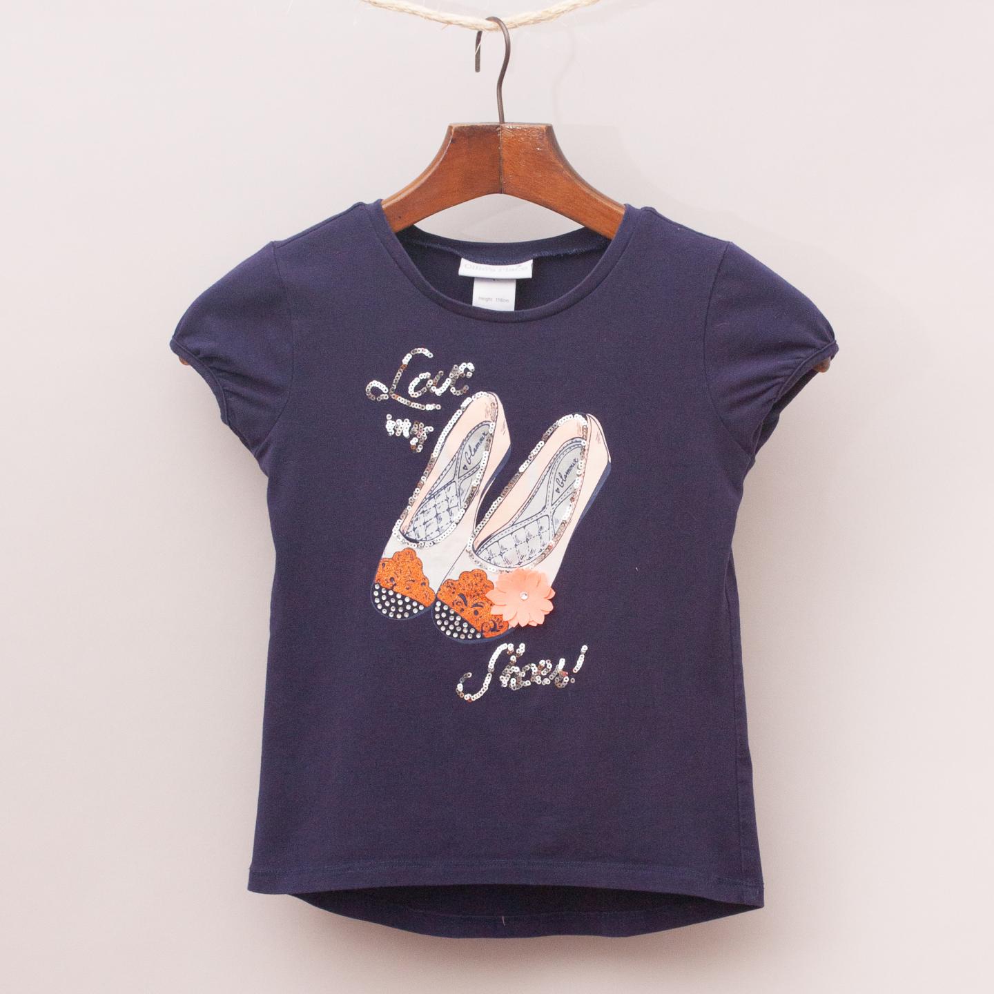 Ollie's Place navy blue t-shirt with embellished ballet slippers on the front and puffed sleeves *95% Cotton, 5% Elastane