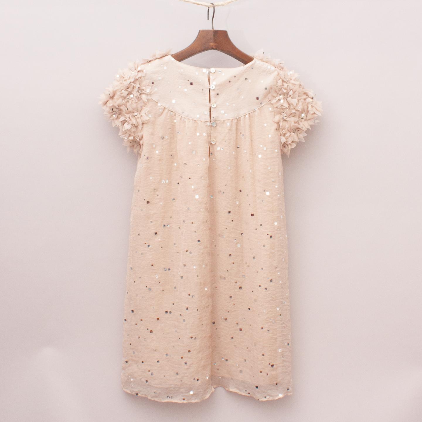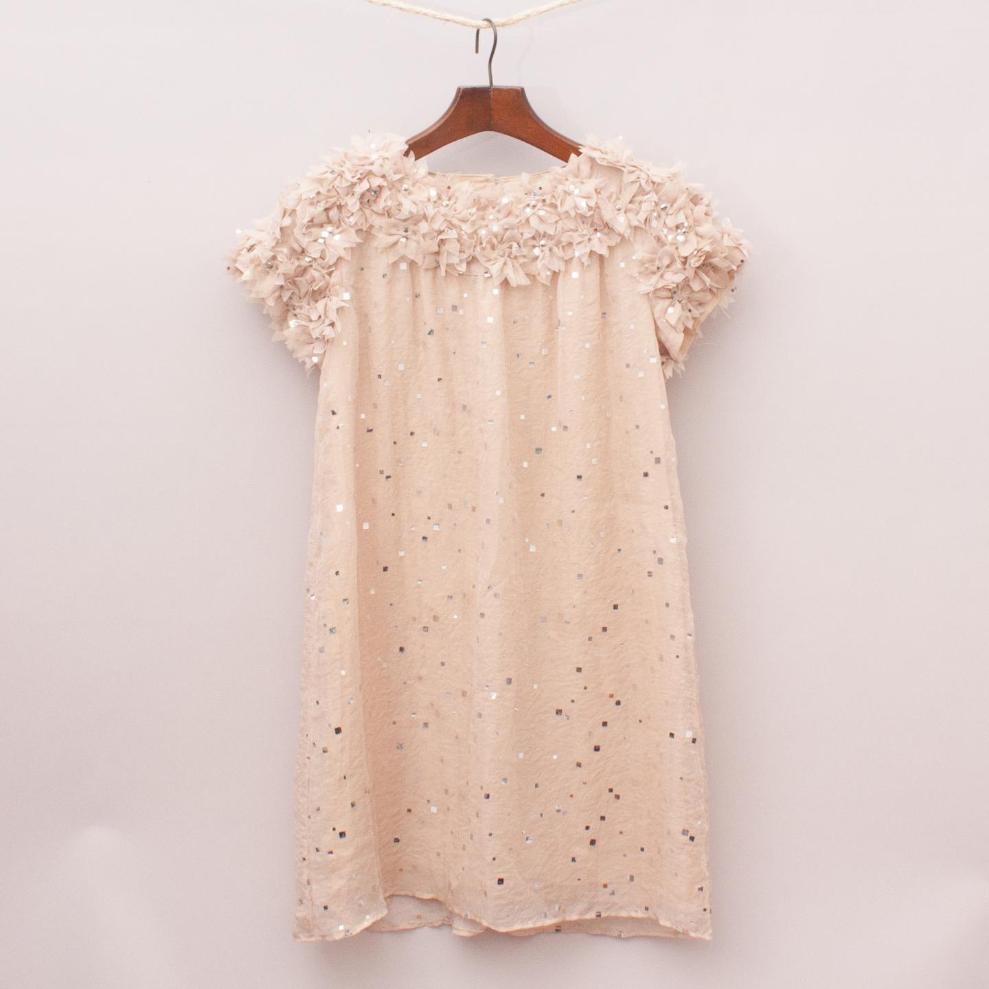 One Red Fly latte toned dress with fabric flowers across the sleeves and neckline, sequins throughout, fully lined and button back closure *100% Polyester/Rayon Blend