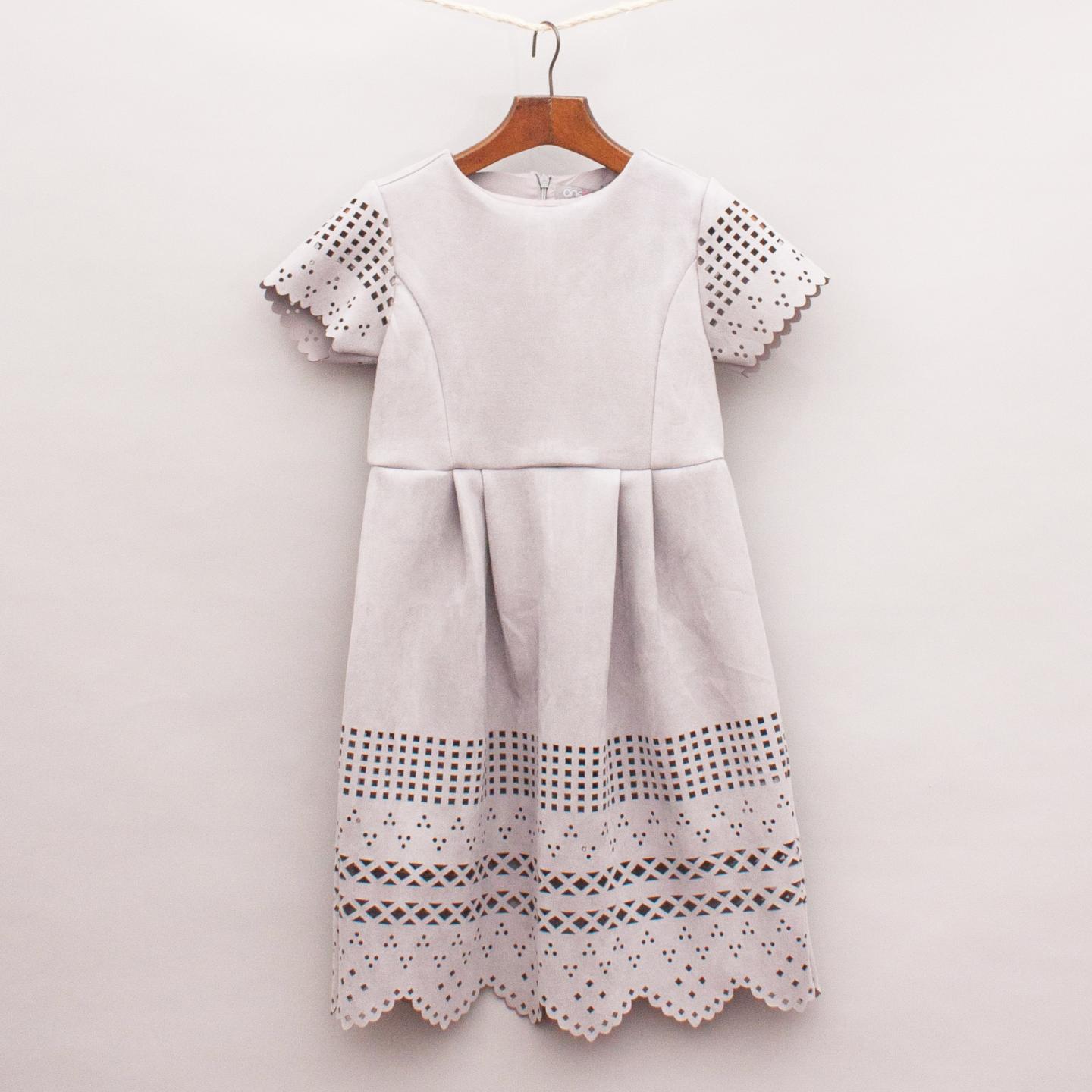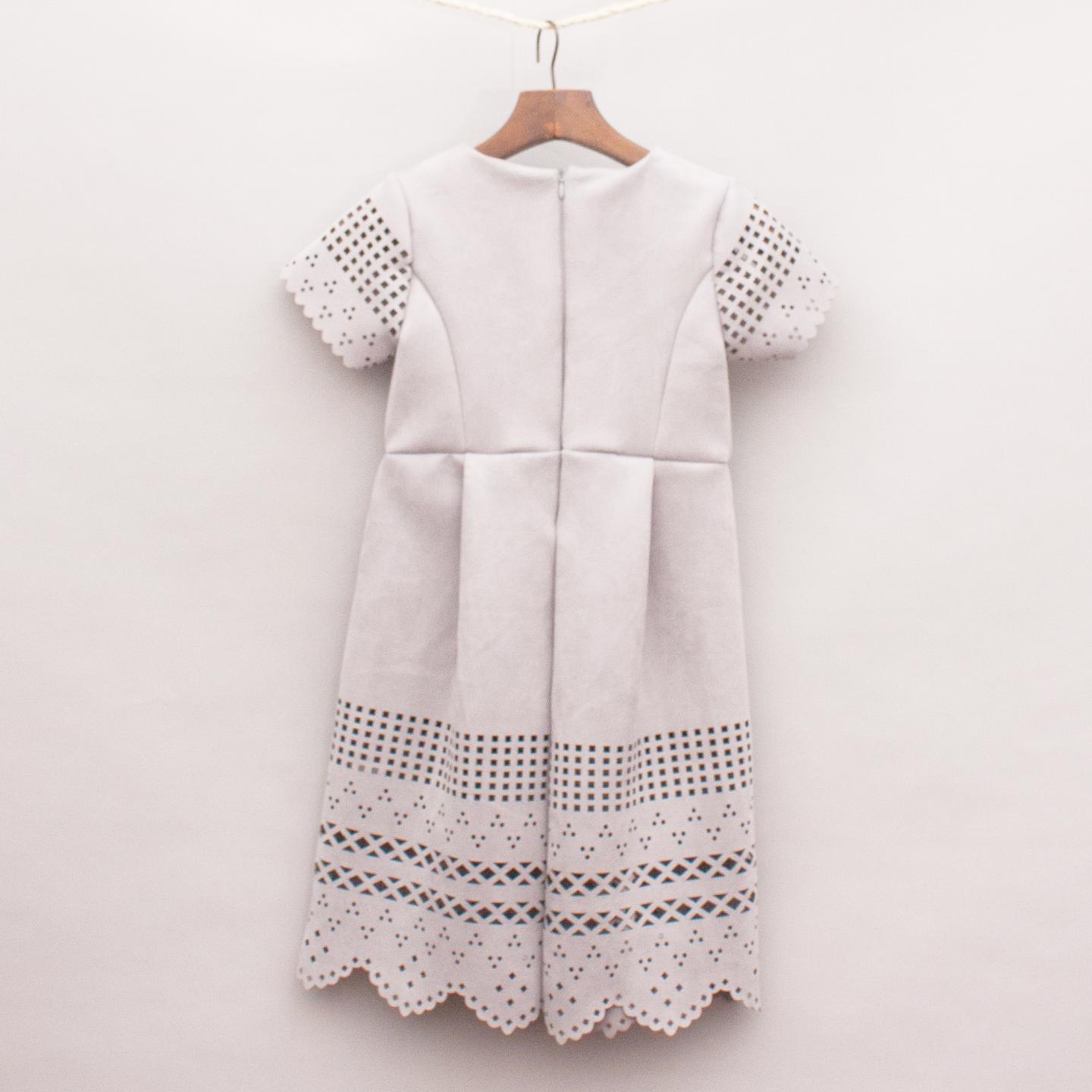 One Red Fly grey suede-like dress with laser cutouts, fitted bodice, full pleated skirt and zip back closure
