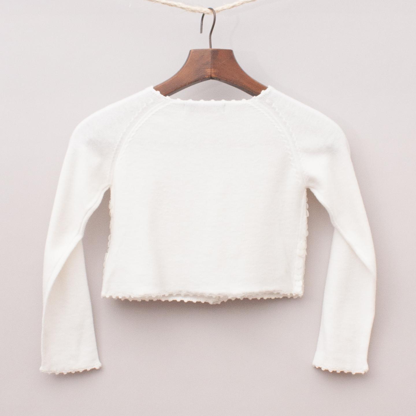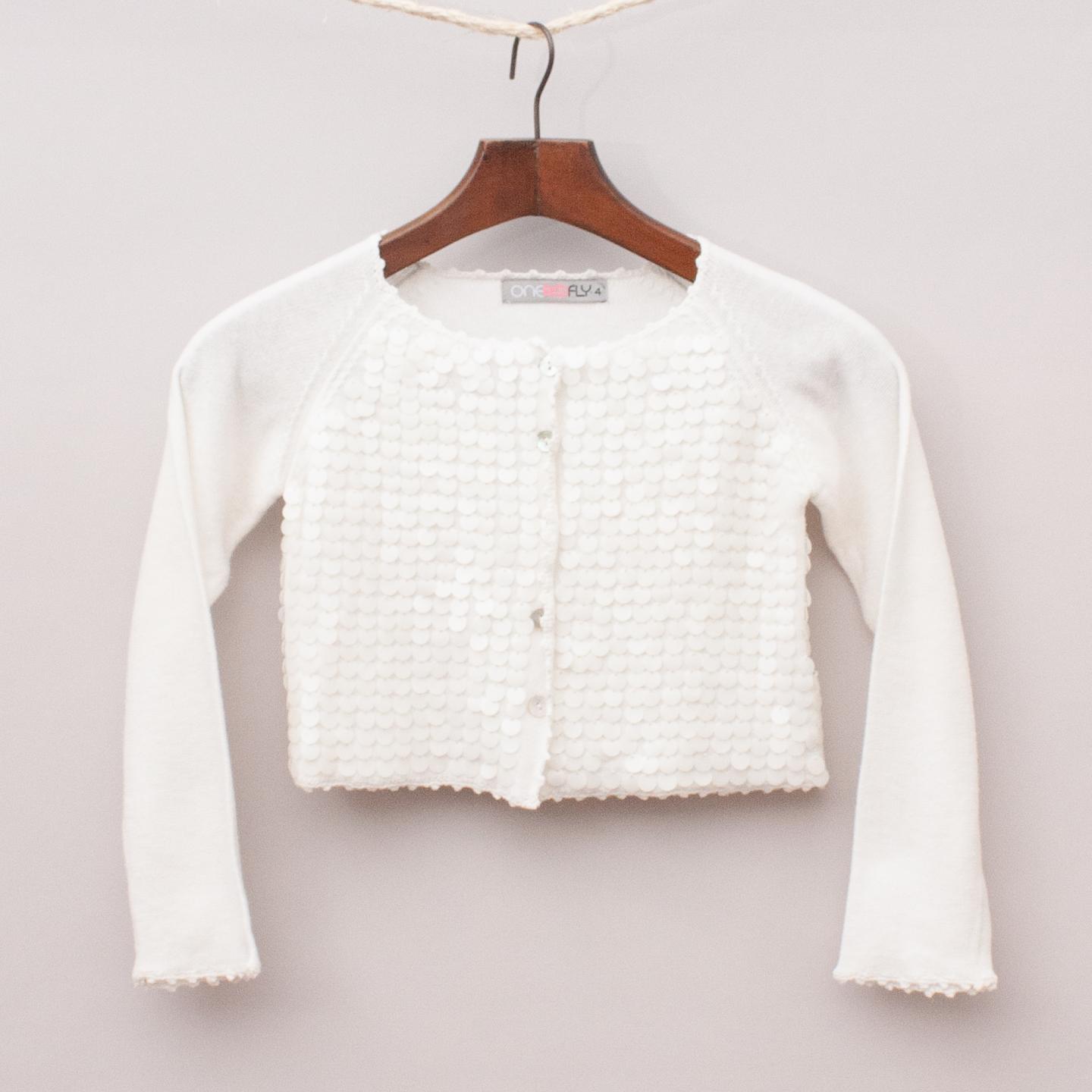 One Red Fly white cardigan with sequin front, scalloped trim and button down front *55% Acrylic, 45% Cotton