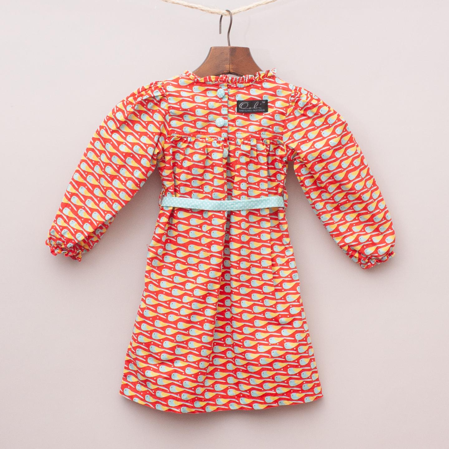 Oobi red, blue and yellow bird patterned dress with gathered front, ruffle cuffs, tie up waist and button down back closure *100% Cotton