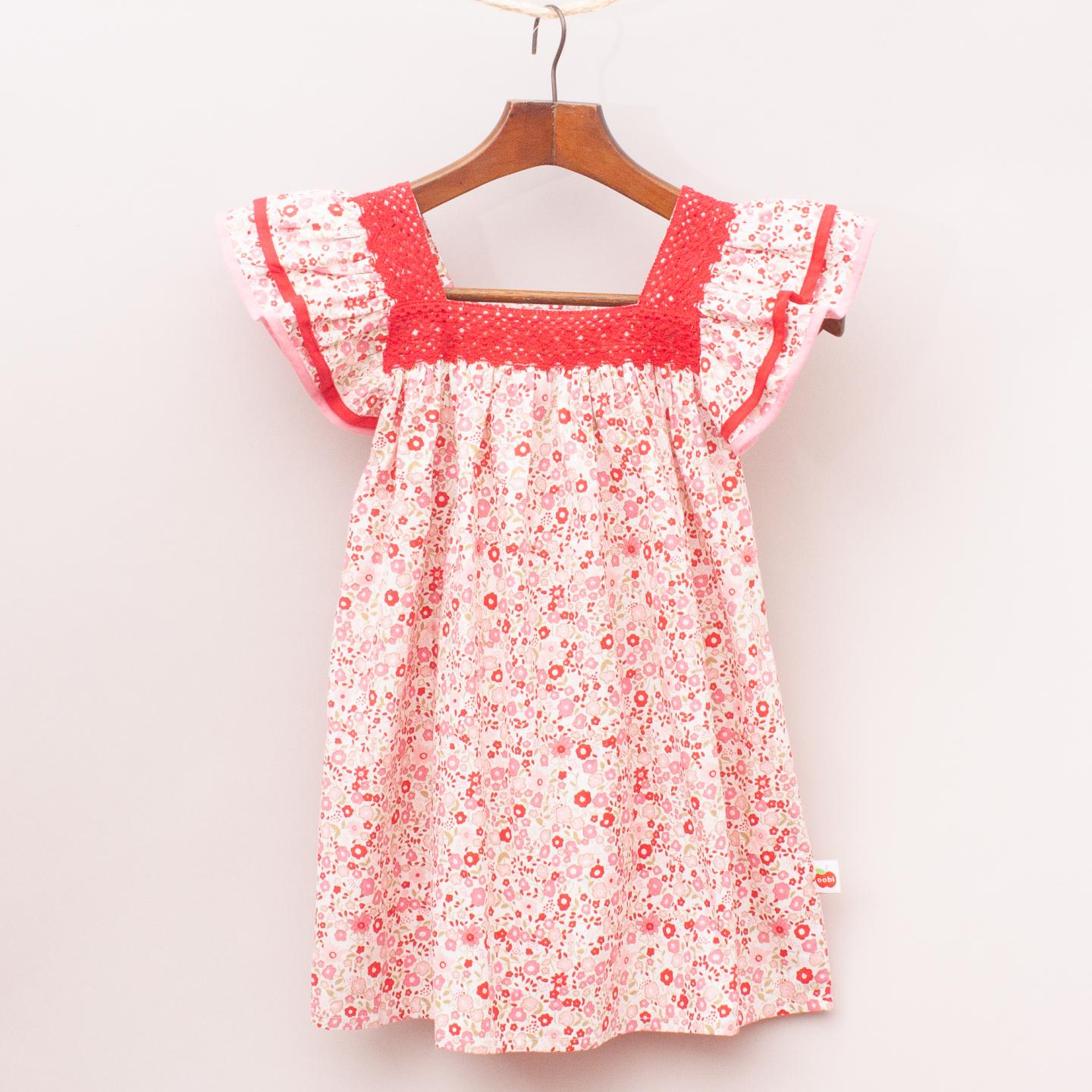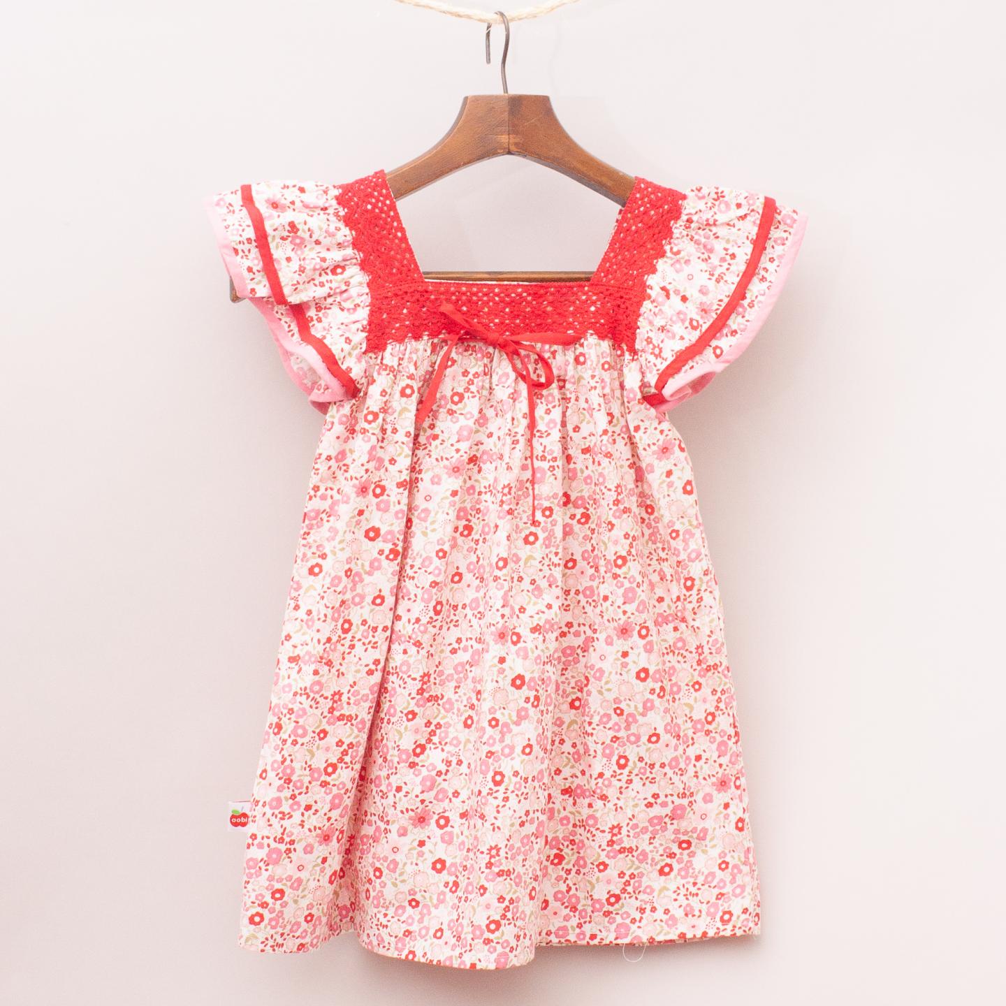 Oobi pink and red patterned dress with ruffle sleeves, lace embroidered square neckline with tie back detail *100% Cotton