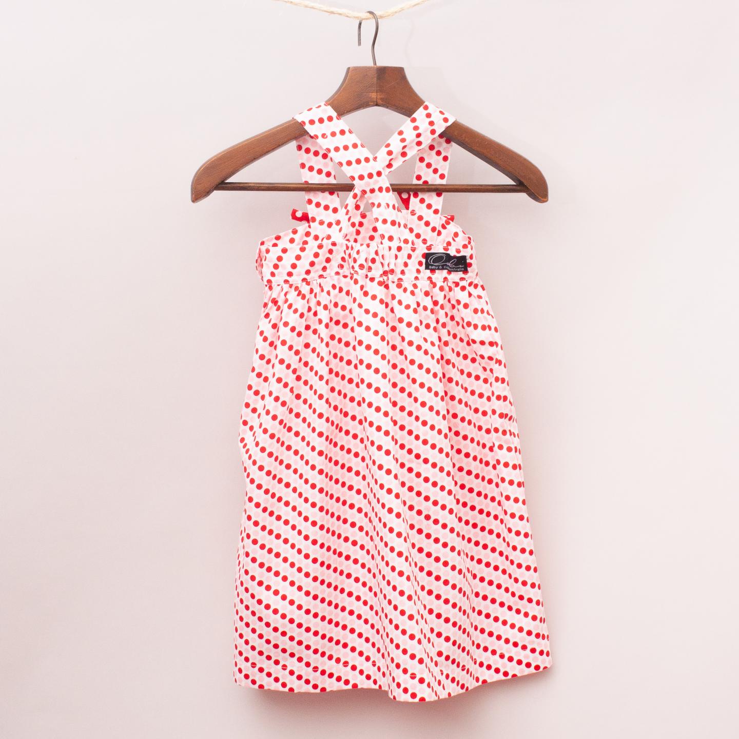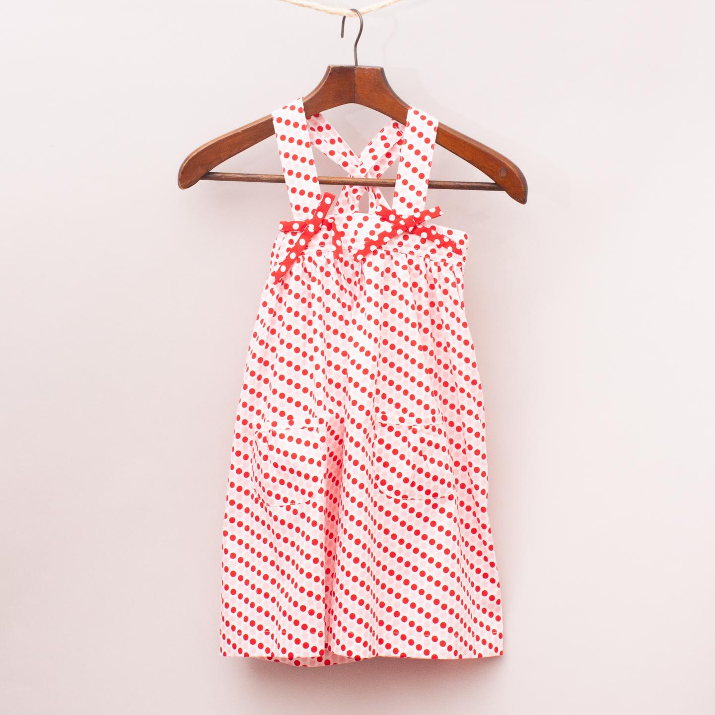 Oobi red, pink and white polka dot patterned dress with two front pockets, bow details and adjustable straps *100% Cotton