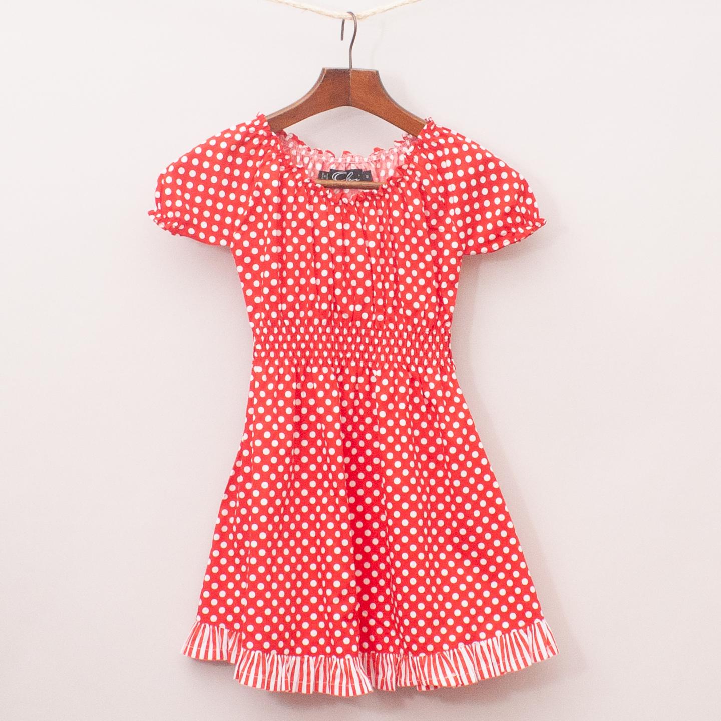 Oobi red and white polka dot dress with puffed sleeves, elastic neckline and waistband with striped ruffle hemline *100% Cotton