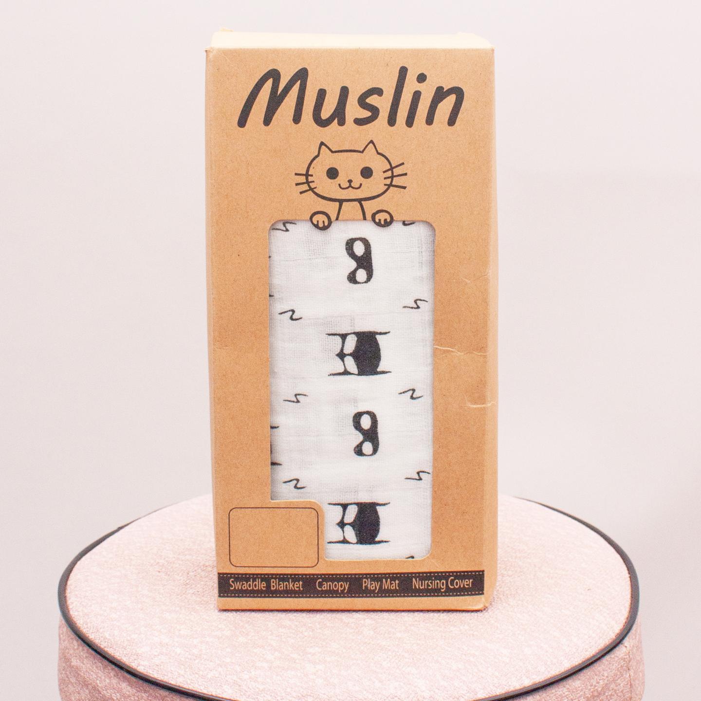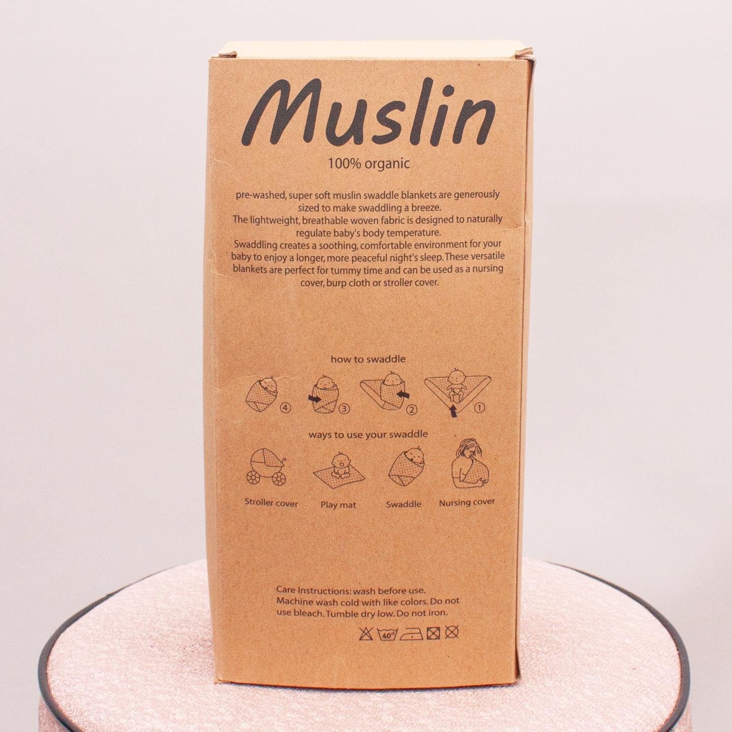 100% organic white muslin baby swaddle with mask print throughout "Brand new in box"