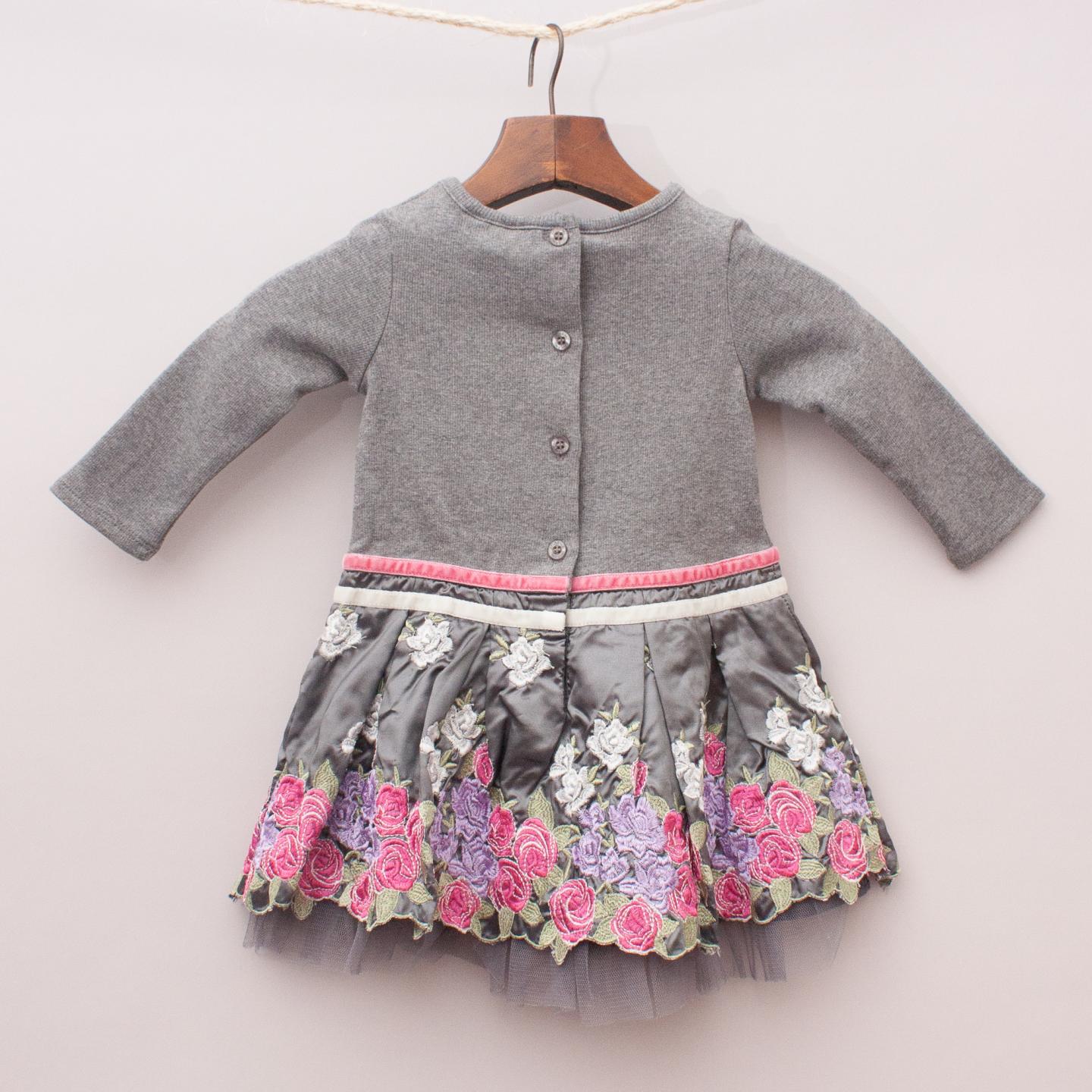 Origami "brand new with tags" grey knit long sleeve dress with satin embroidered floral skirt with tulle lining and button down back closure *Cotton/Elastane/Polyester Blend