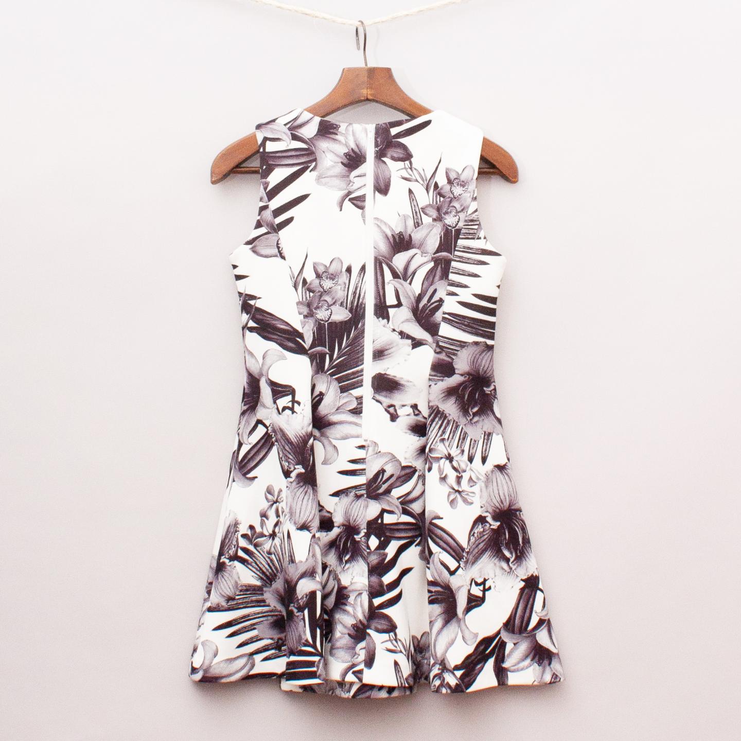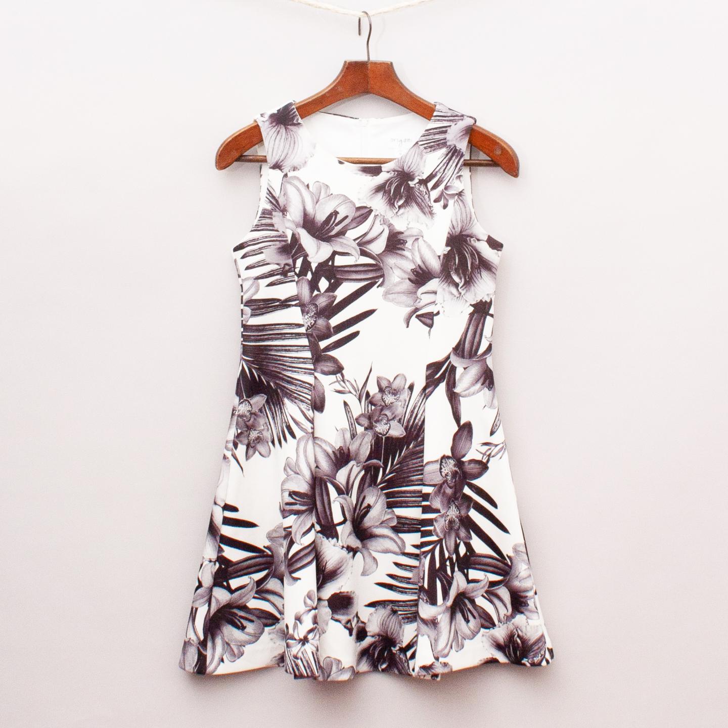 Origami white and grey floral patterned fitted dress with soft pleated panelling, double bonded fabric and full zip back closure