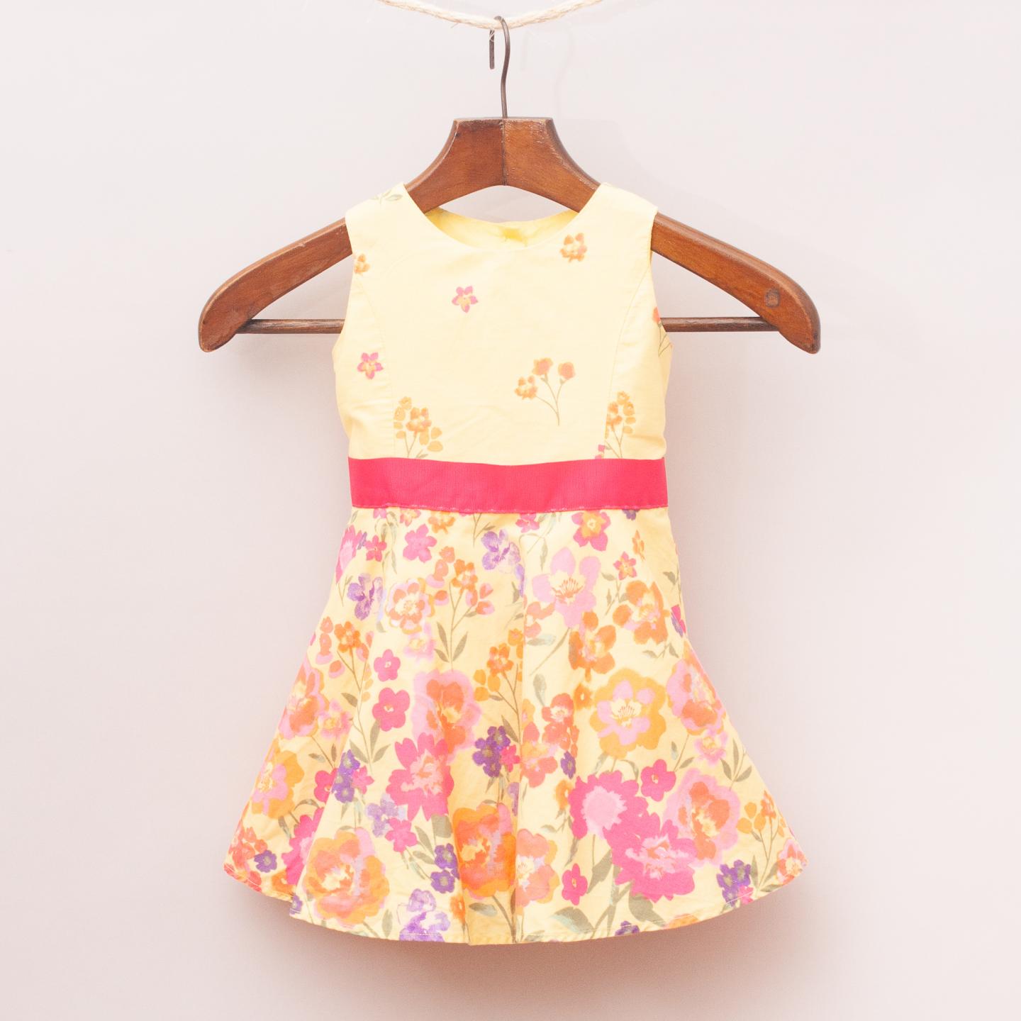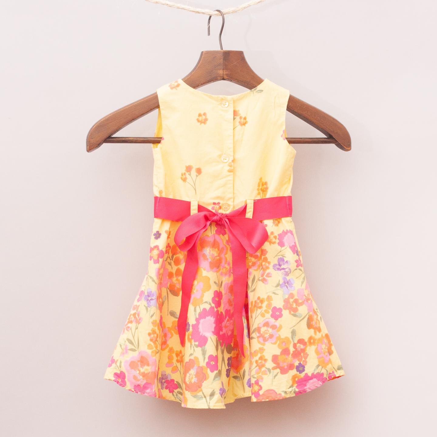 Origami yellow dress with floral pattern throughout and puffy skirt with hot pink belt and tie and button down back closure *100% Cotton