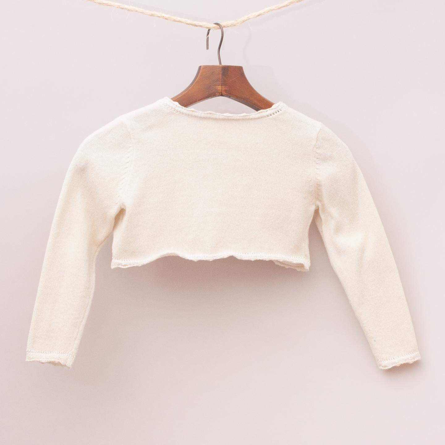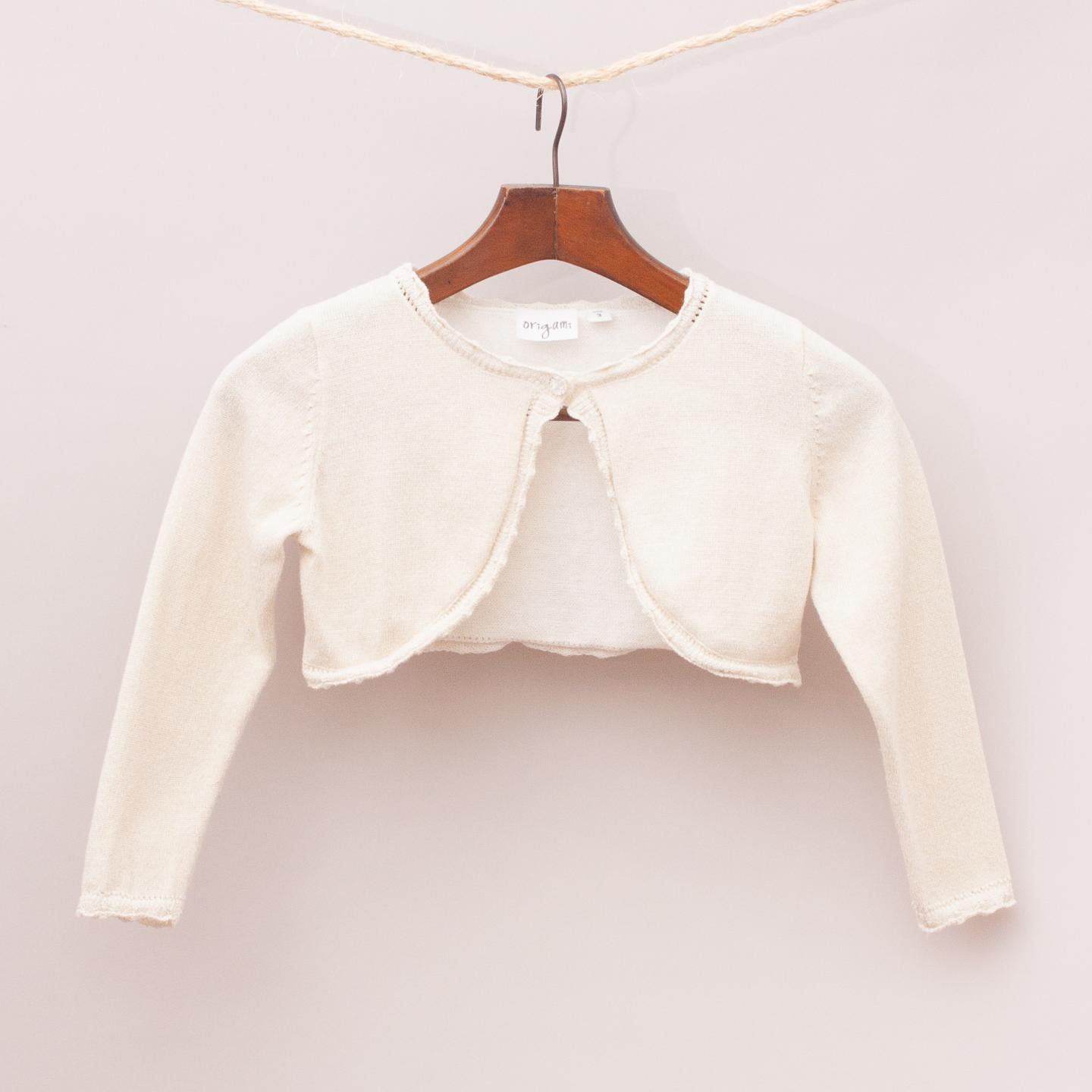 Origami cream and gold flecked cropped cardigan with scalloped trim and single button closure *90% Cotton, 6% Nylon, 4% Metallic