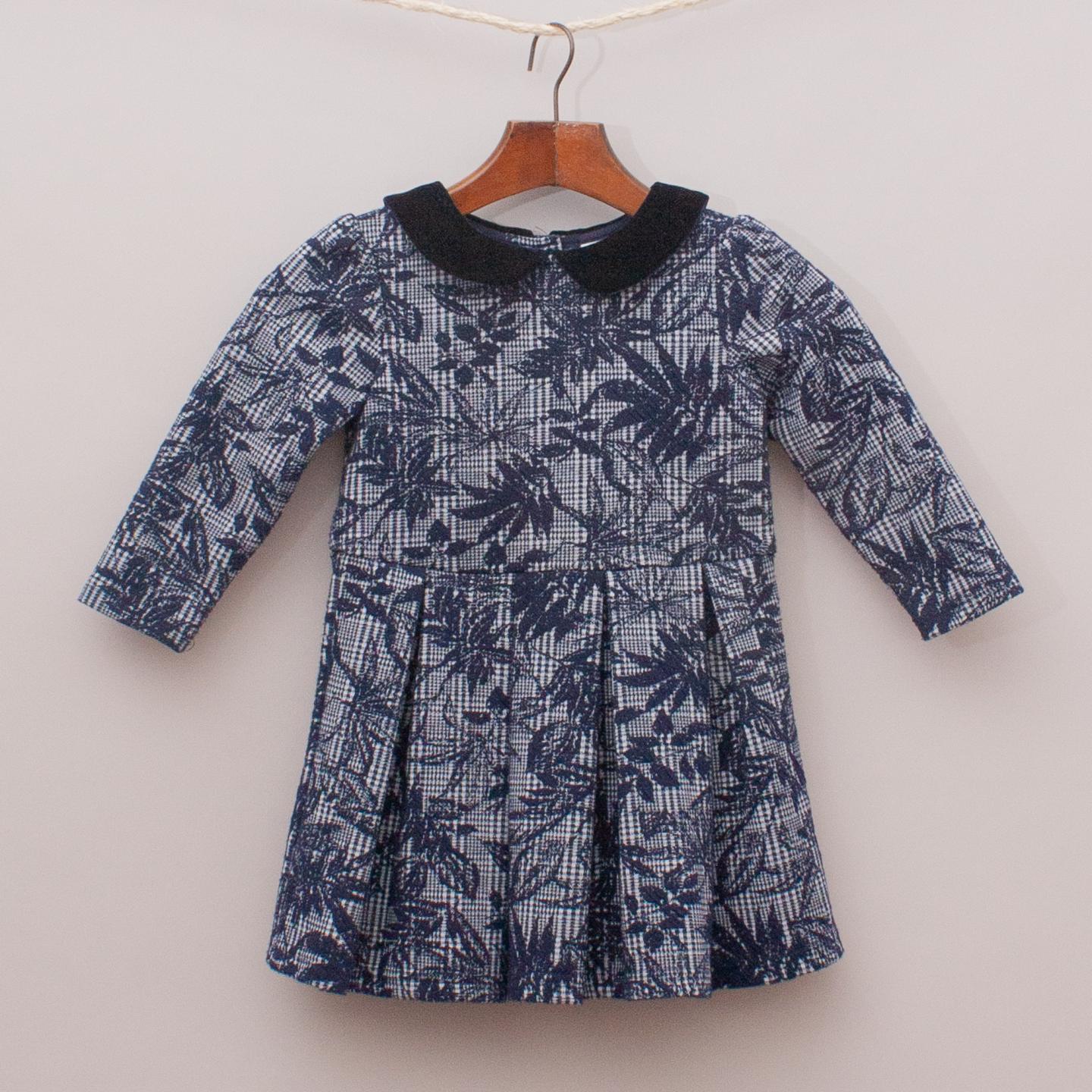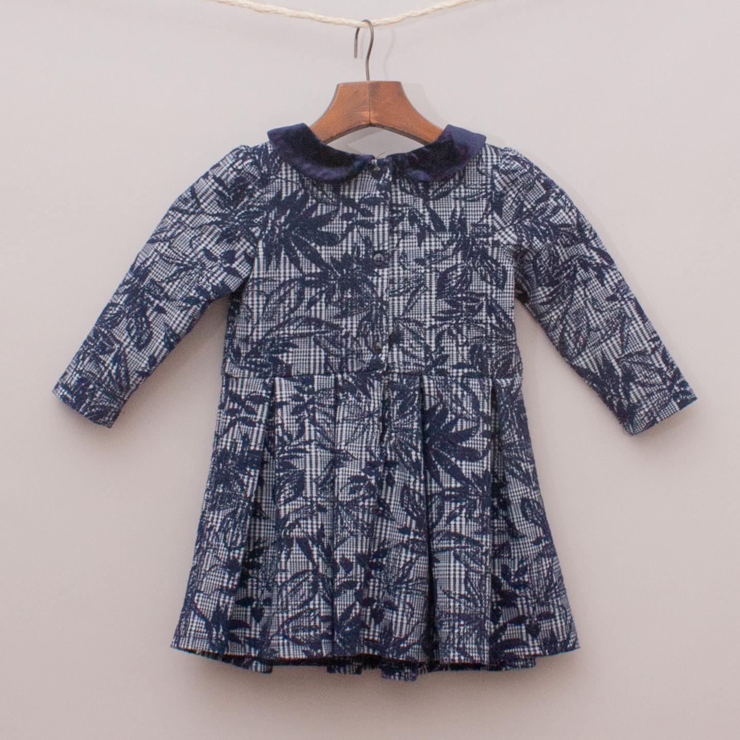 Origami blue and white dress with leaf pattern throughout, velvet collar, pleated skirt and button down back closure