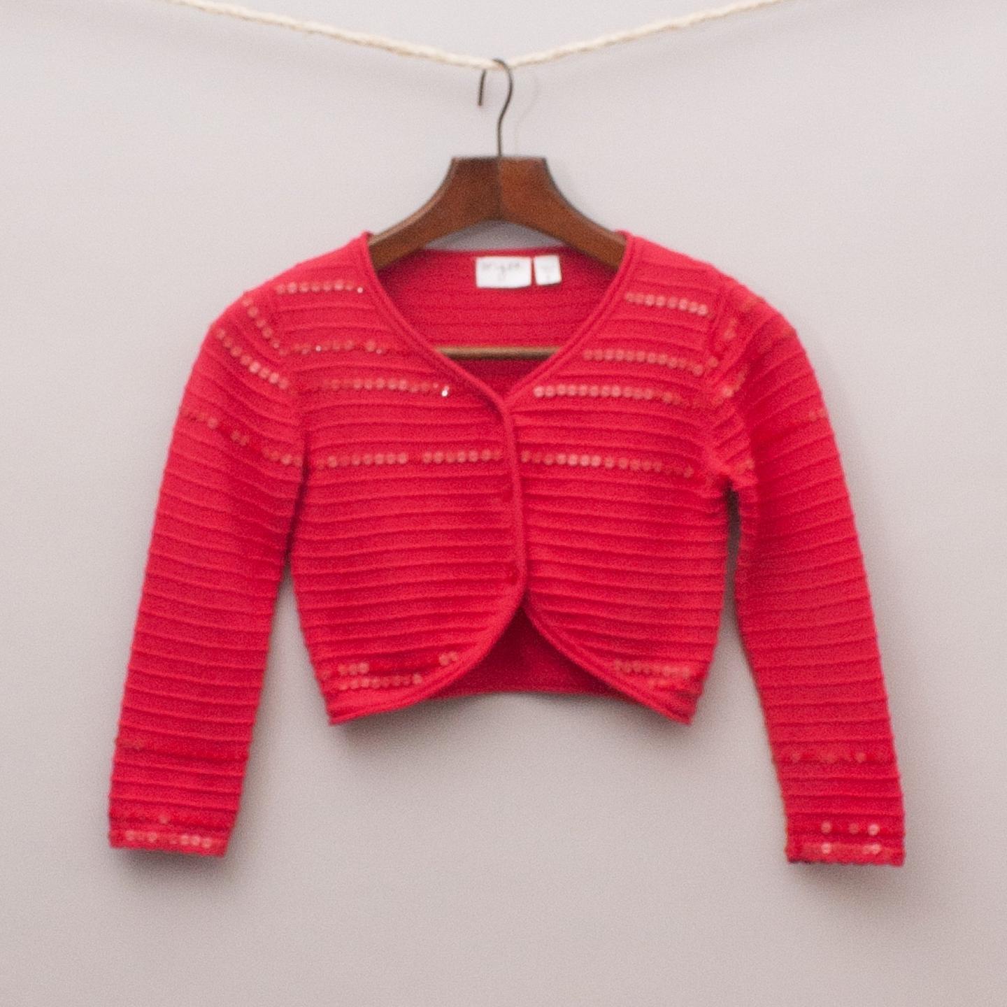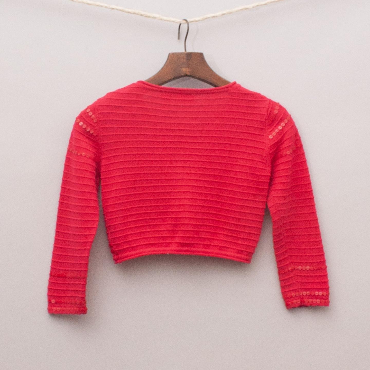 Origami red sequin embellished cardigan with rolled edge details and button down front