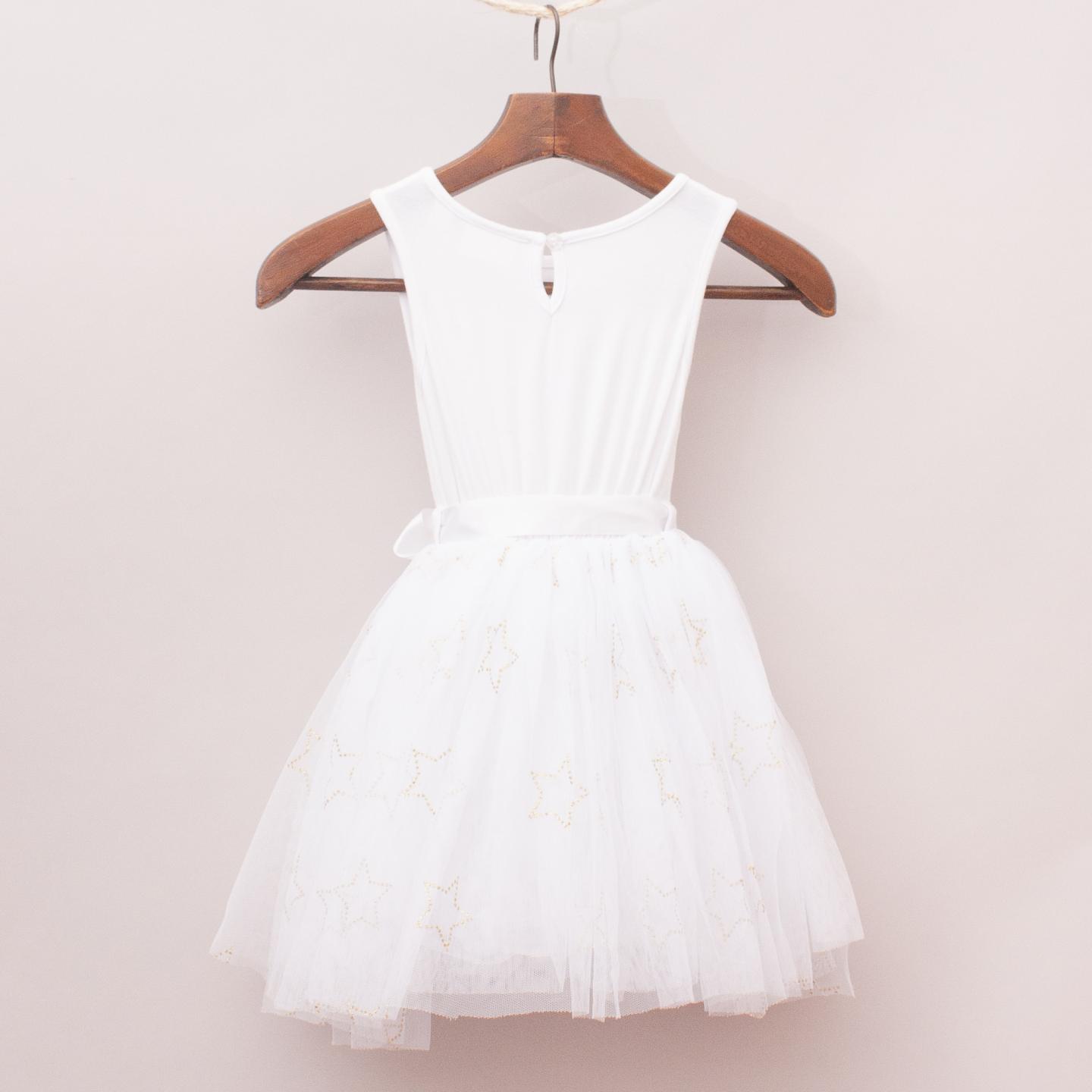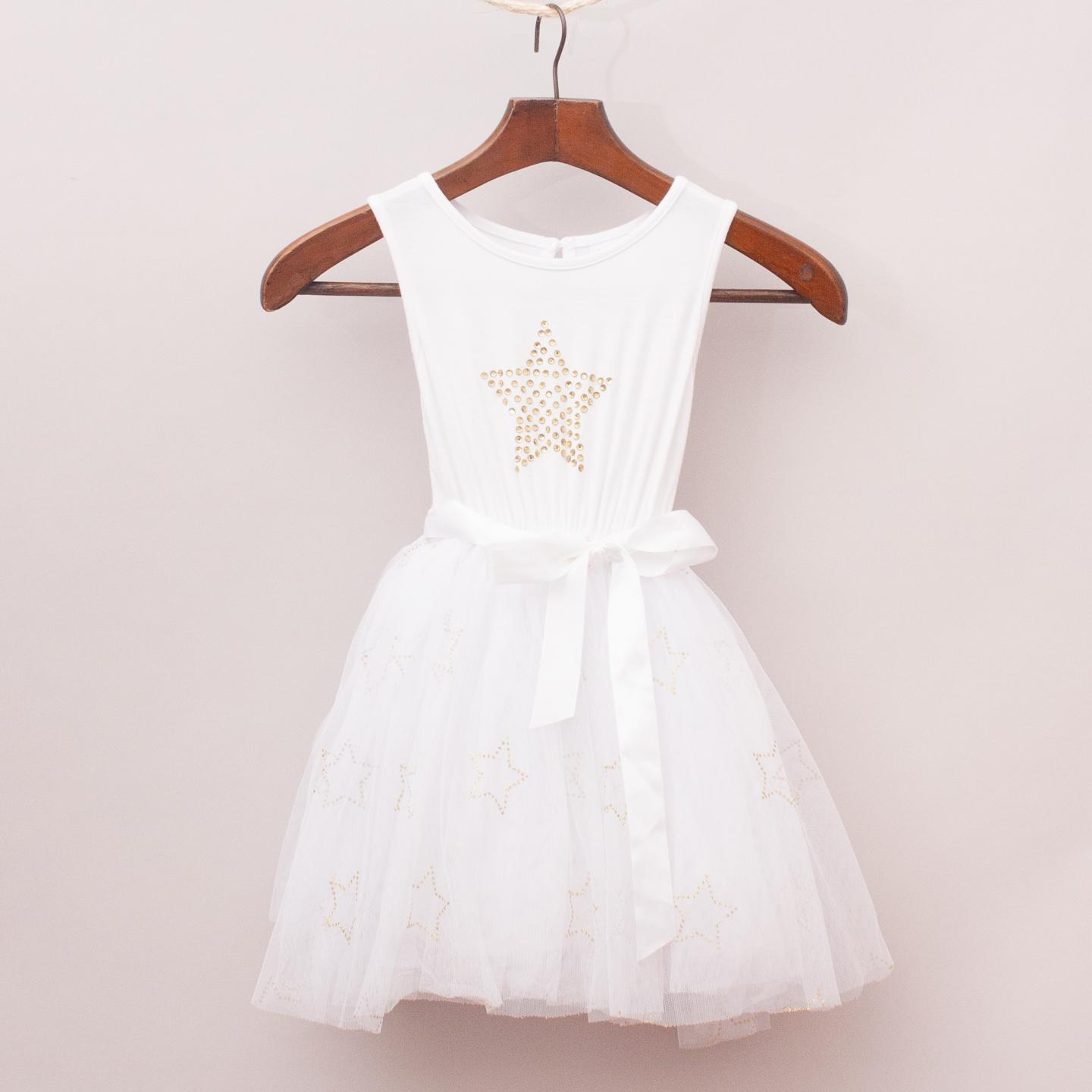 Origami white dress with diamante star on the front, full star patterned tulle skirt and white satin ribbon tie *95% Viscose, 5% Elastane