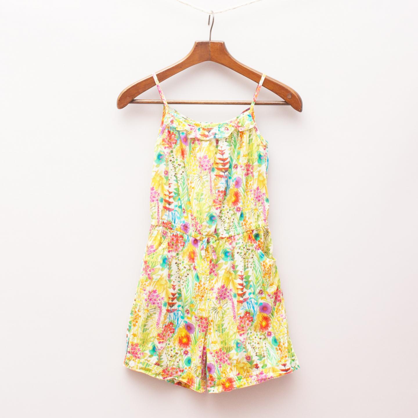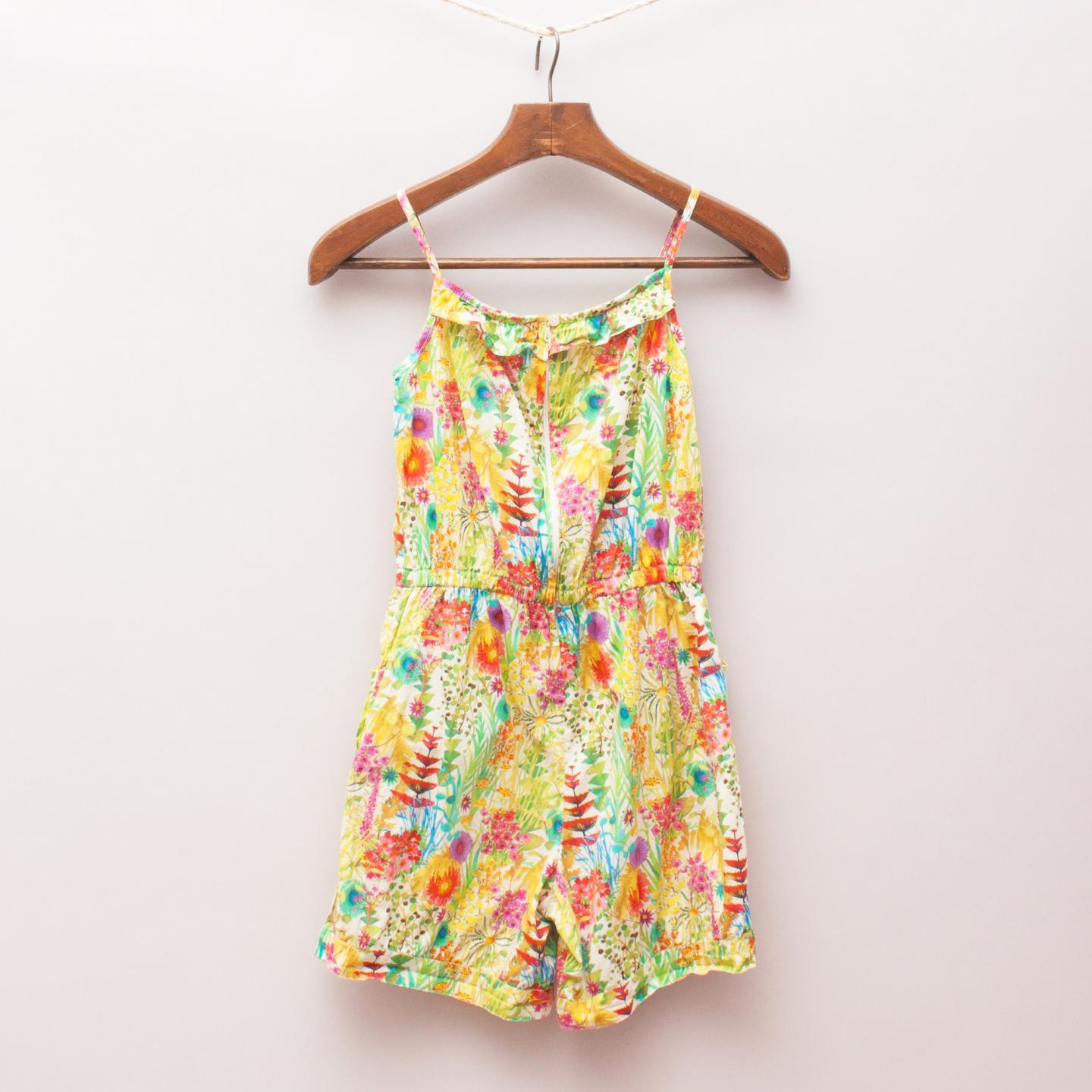 Oscar de la Renta brightly coloured sleeveless playsuit with ruffled neckline, elastic waistband with tie, two front pockets and zip back closure