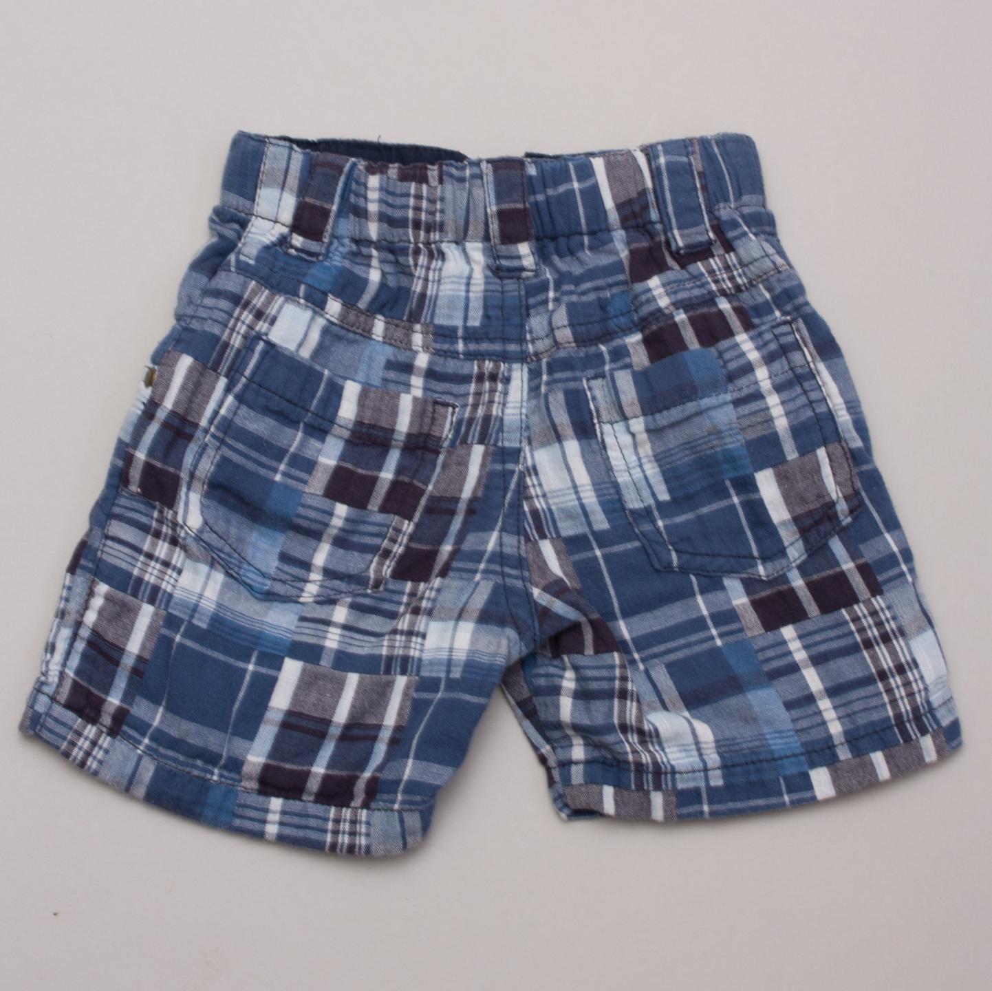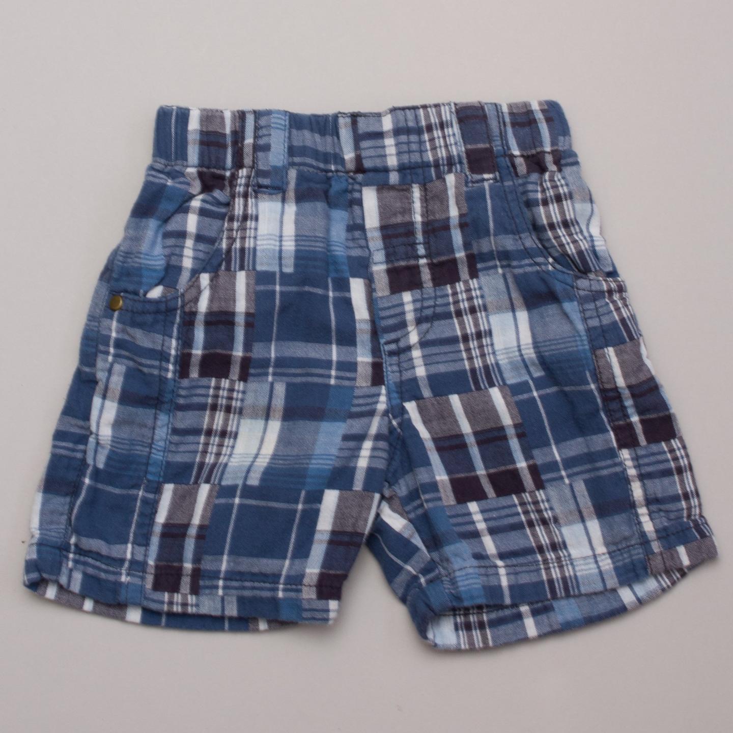 OshKosh blue and grey plaid shorts with front and back pockets, belt loops and elastic waistband