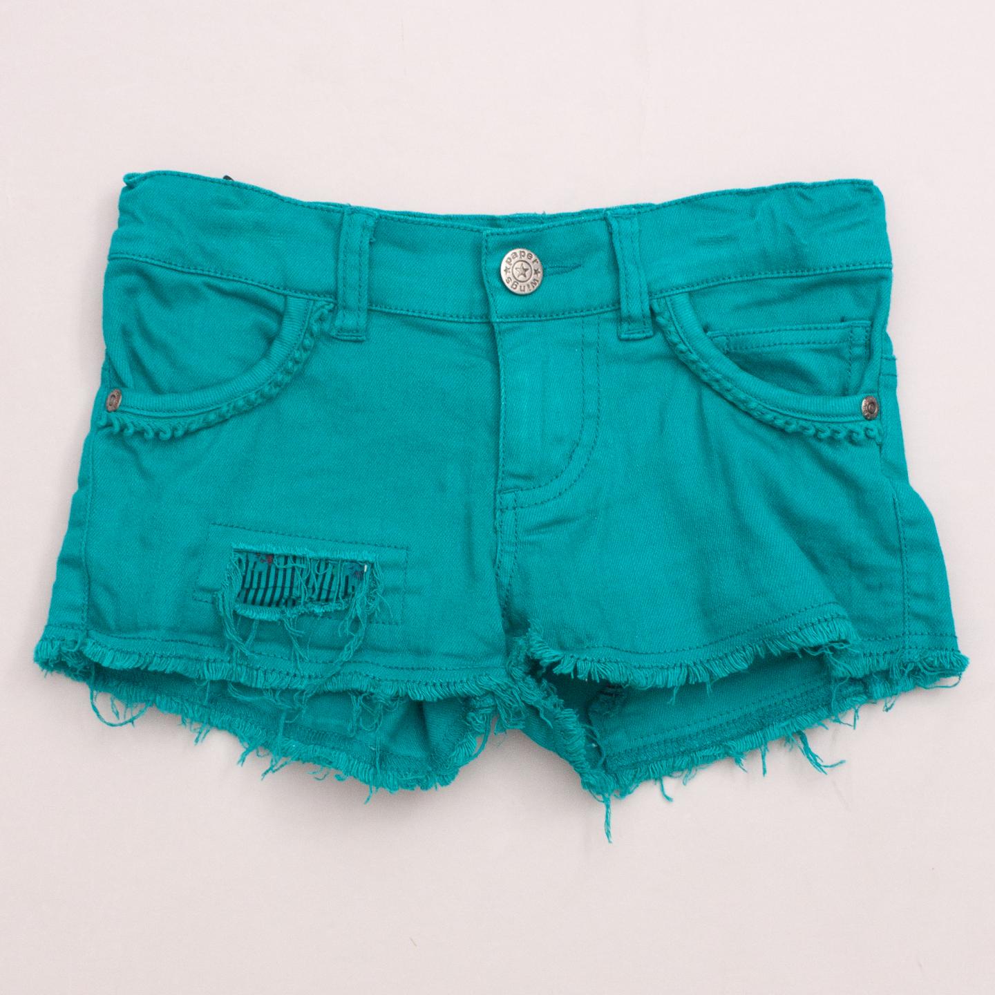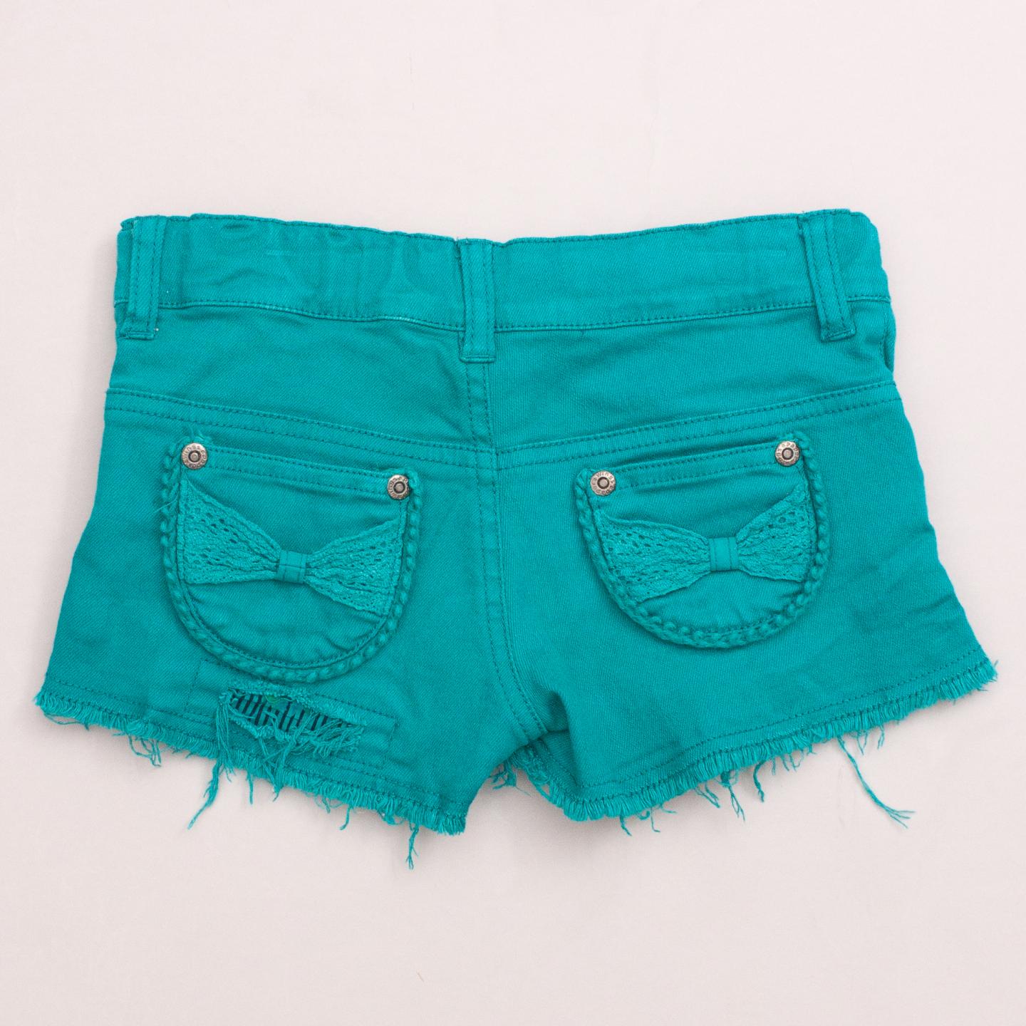 Paper Wings emerald denim shorts with looped trim detail, raw edge, front and back pockets, belt loops and button/zip fastening *95% Cotton, 5% Elastane