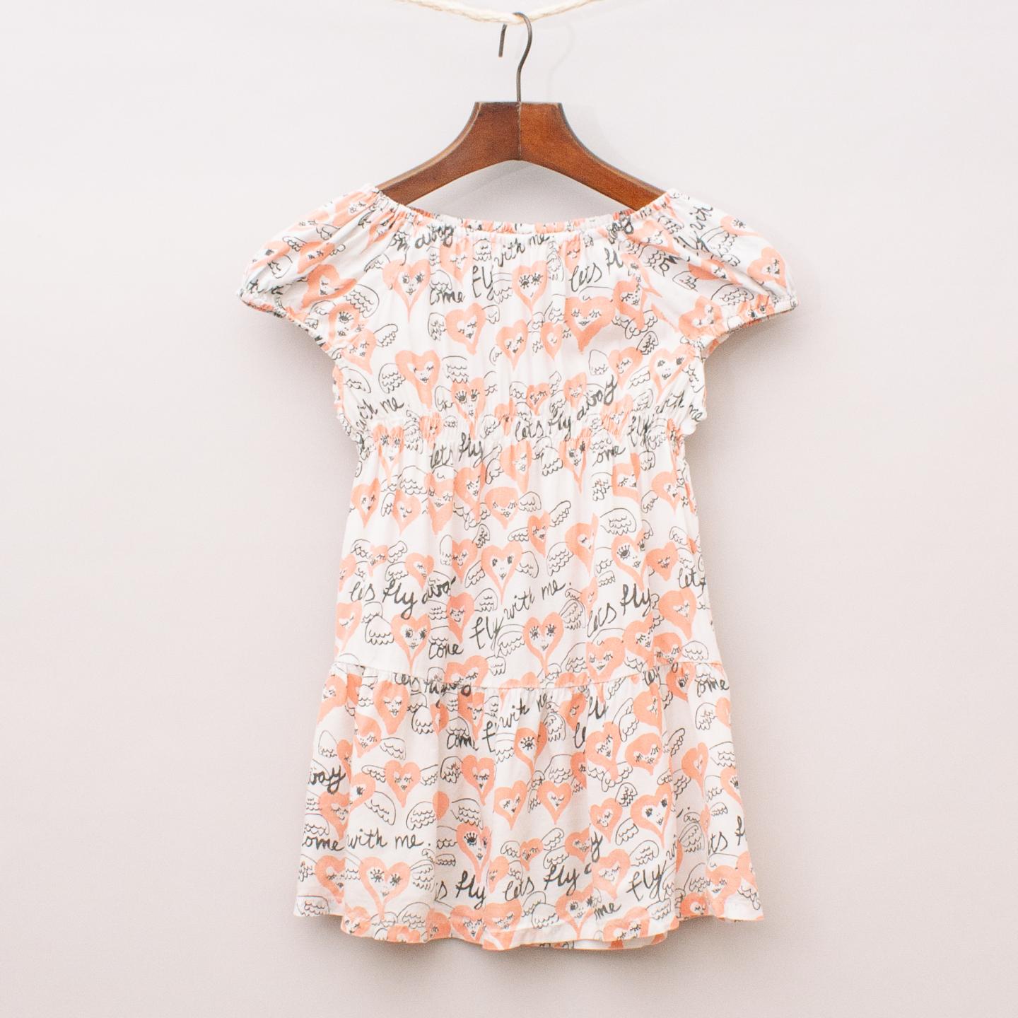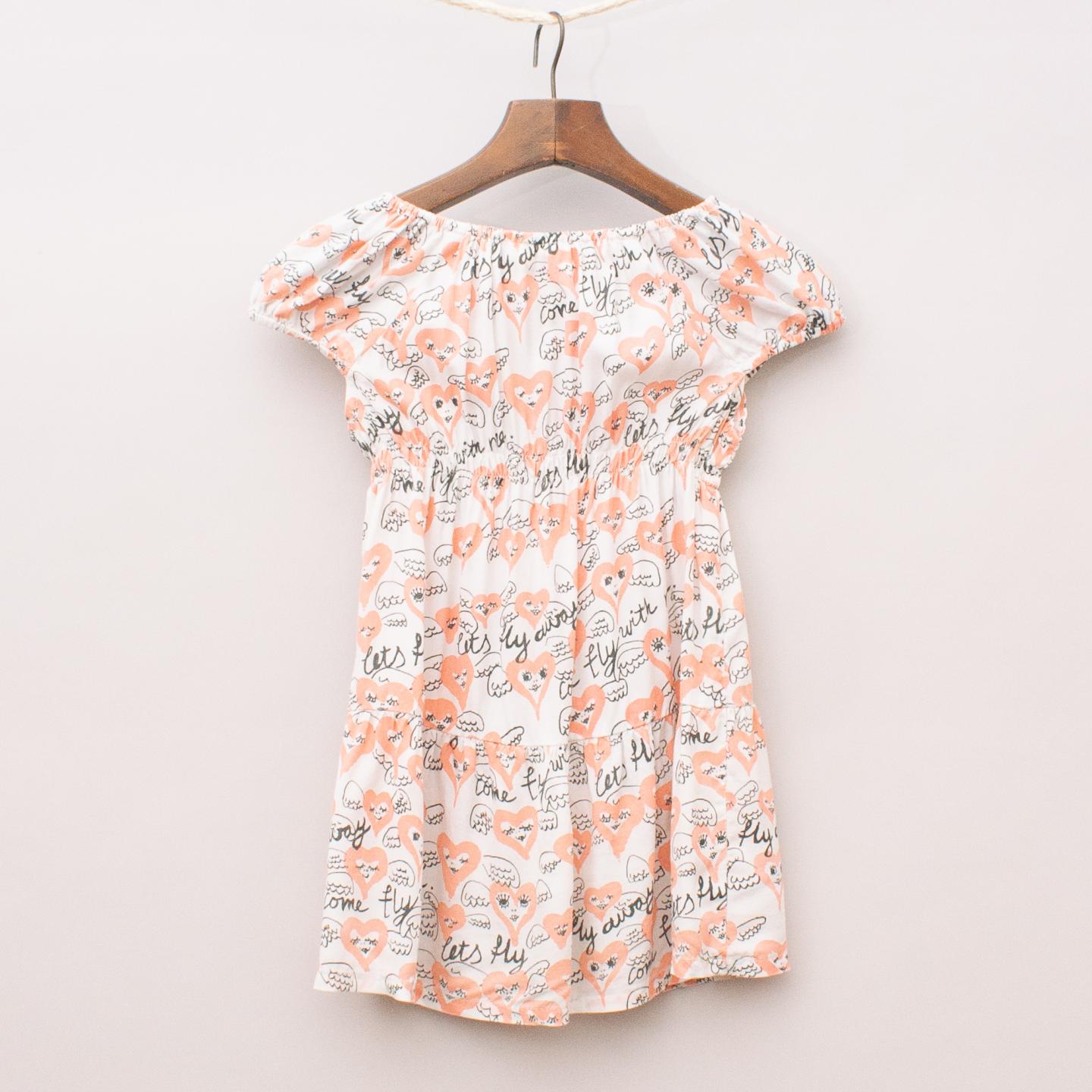Paper Wings white and heart patterned dress with elastic waistband and neckline, puffed sleeves and ruffle hemline *100% Viscose