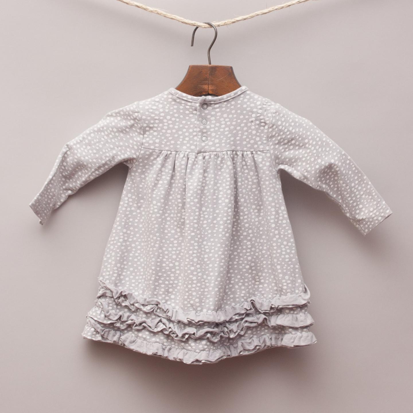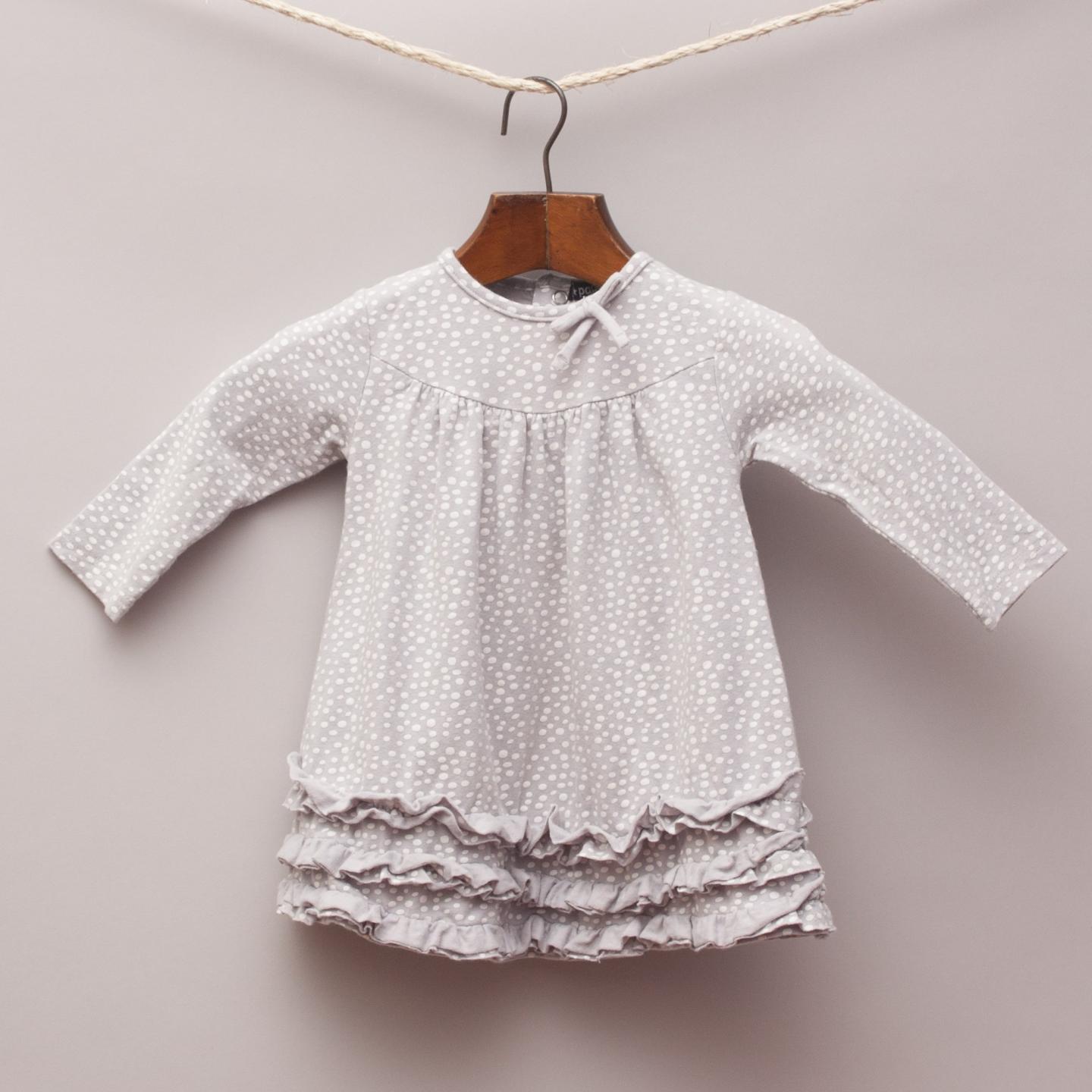 Papoose grey dress with white polka dots throughout, ruffled hemline and long sleeves with three button down back closure