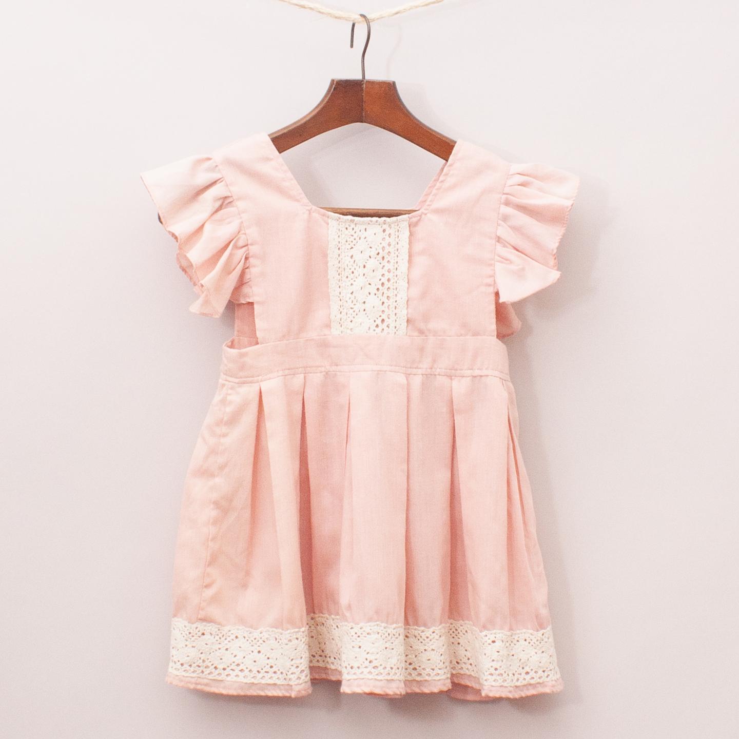 Pastel pink pinafore style dress with ruffle sleeves, pleated skirt and broderie anglaise trim with zip back closure *955 Cotton, 5% Polyester