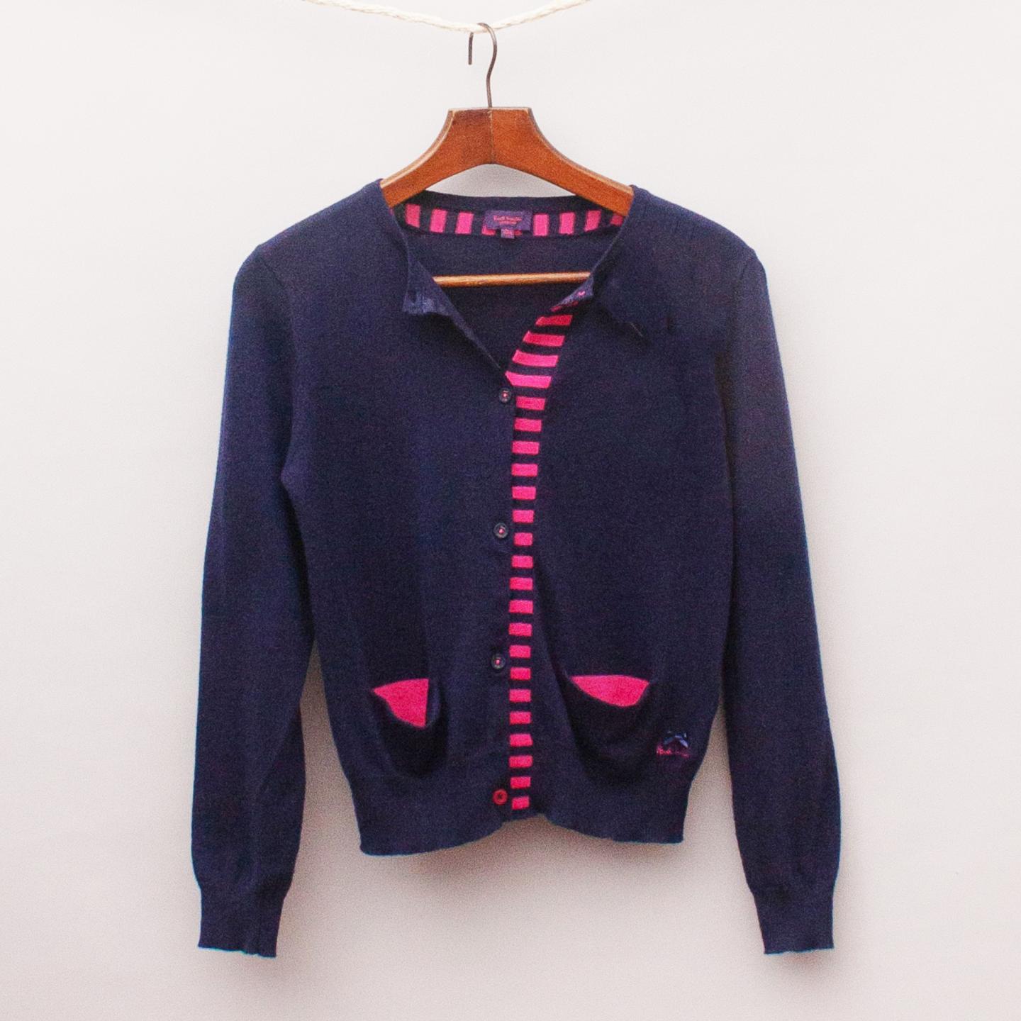 Paul Smith navy blue cotton & cashmere cardigan with candy pink stripe, two front pockets and full button down front
