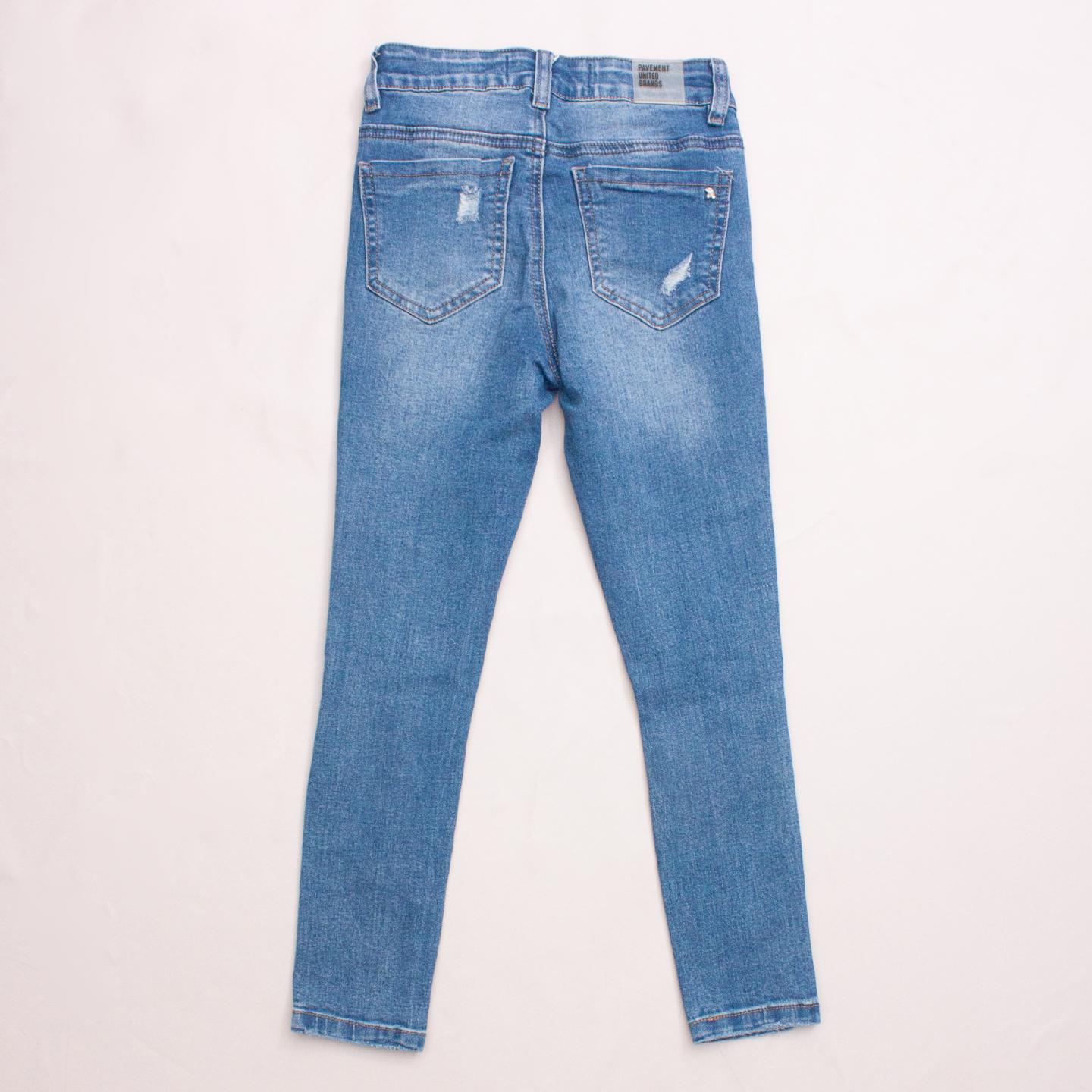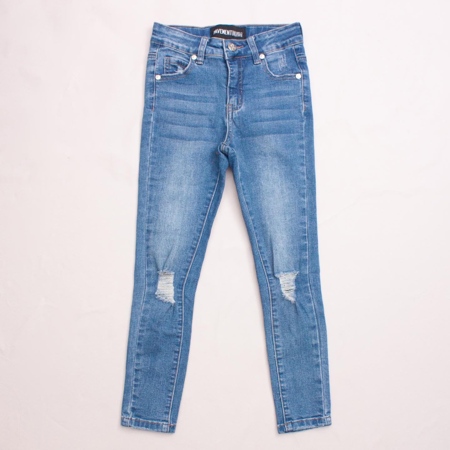 Pavement distressed skinny blue jeans with front and back pockets, belt loops and button/zip fastening