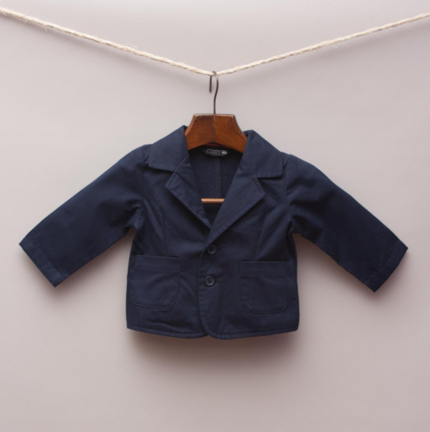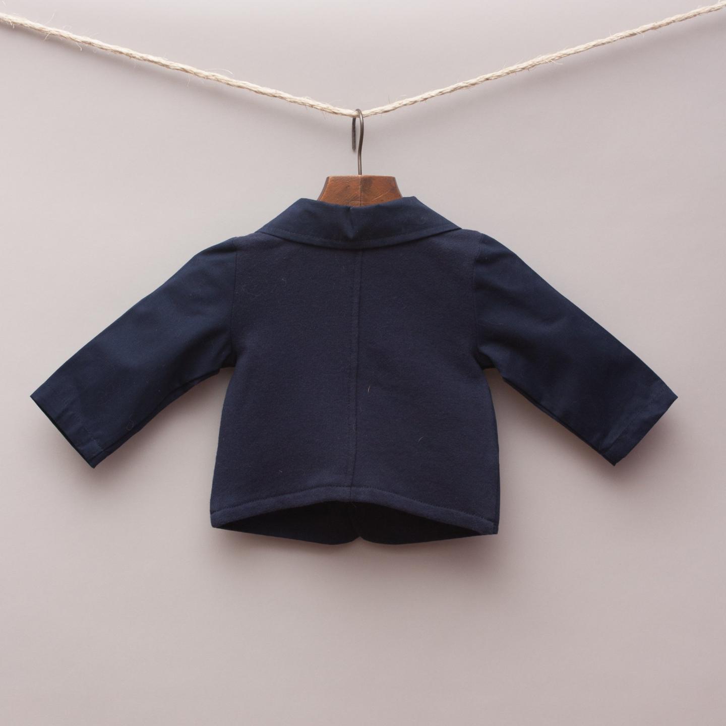 Peter Morrissey navy blue blazer with contrasting fabric back, two front pockets and two button up front