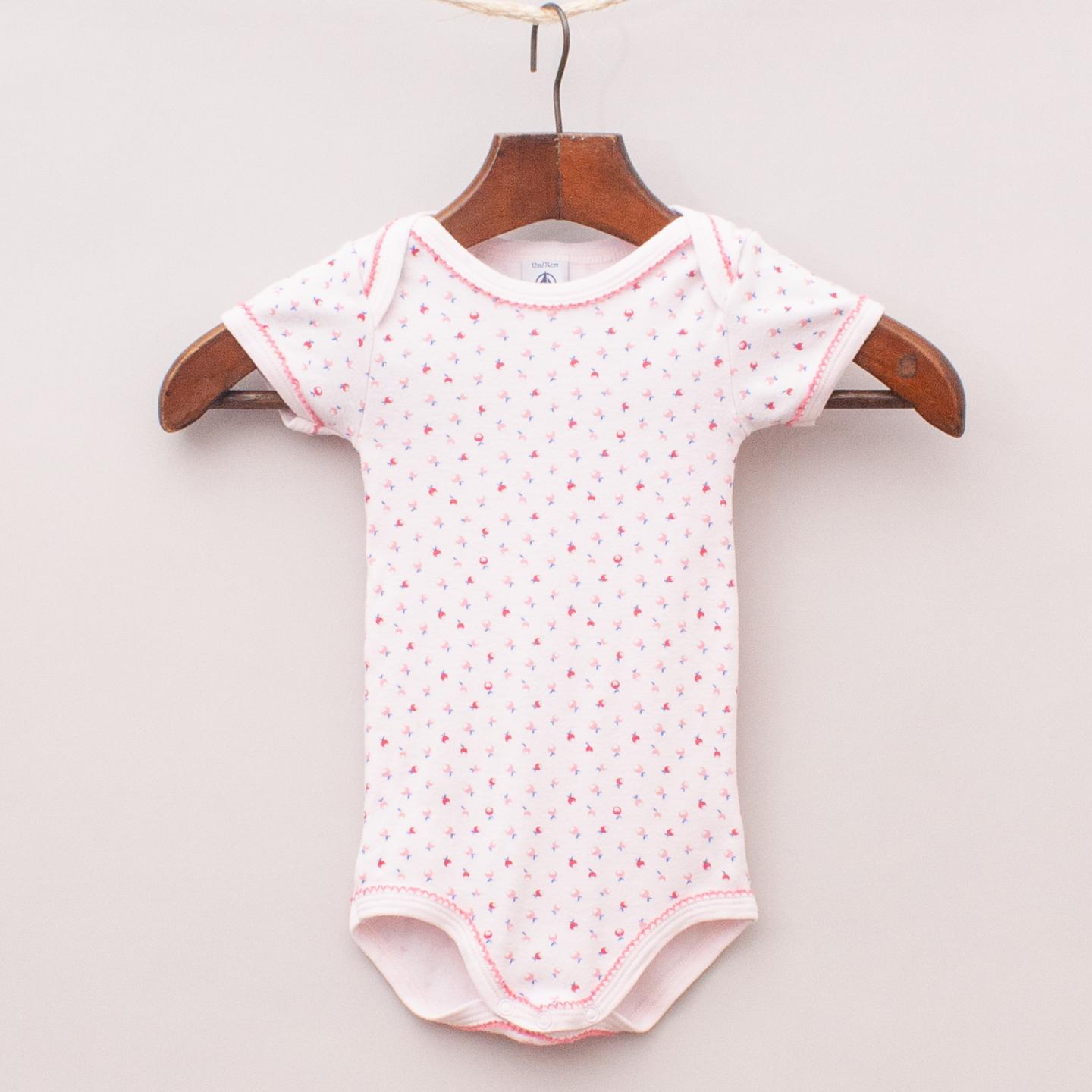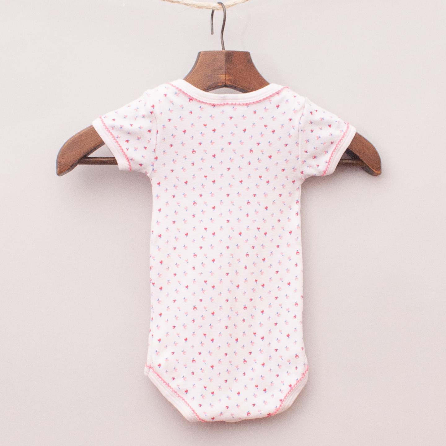 Petit Bateau pastel pink and apple patterned short sleeve romper with white and scalloped trim and snap button closures *100% Cotton