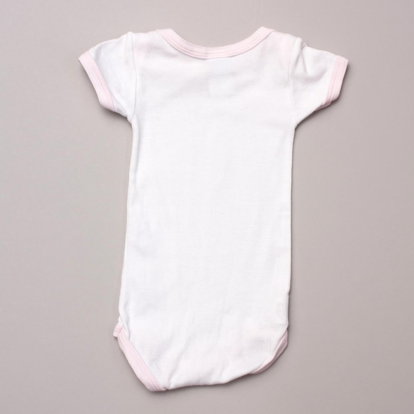 Petit Bateu soft pink short sleeve romper with simple print on the front and crotch button closure