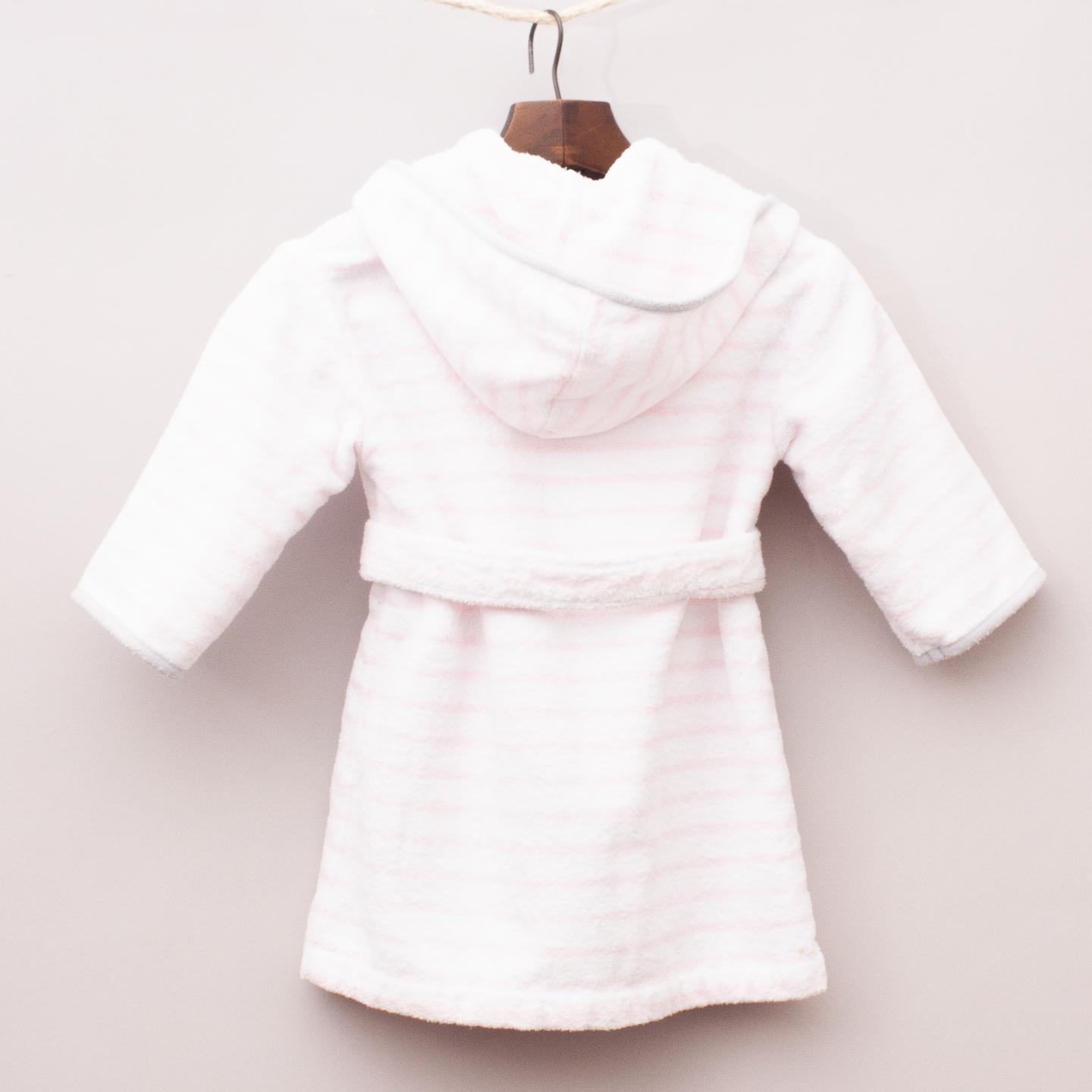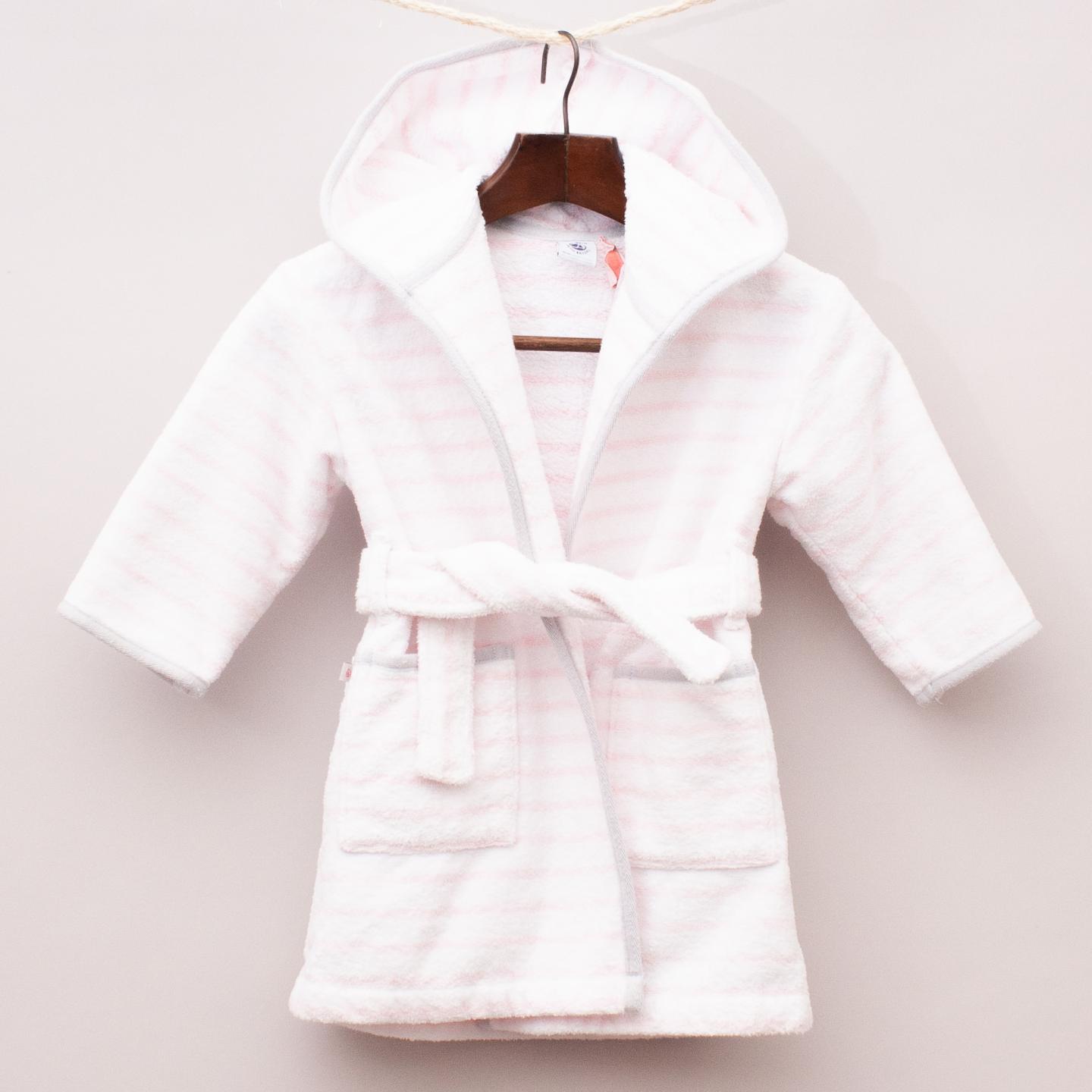 Petit Bateau white and pink striped hooded dressing gown with grey trim, two front pockets and tie up waist - Size 2