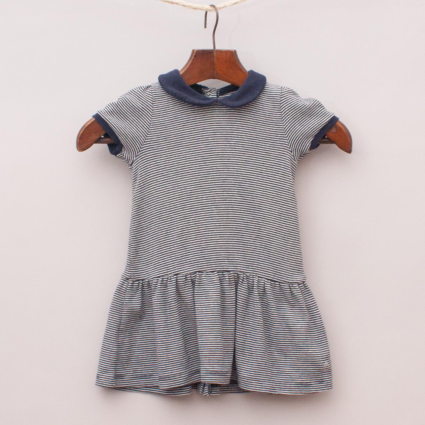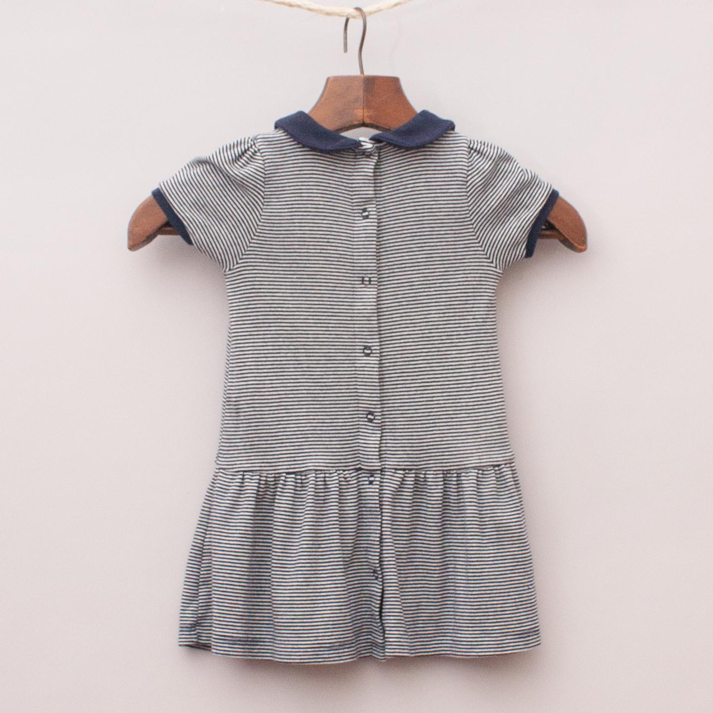 Petit Bateau navy blue and white striped dress with plain collar and trim, ruffle skirt and full button back closure *100% Cotton