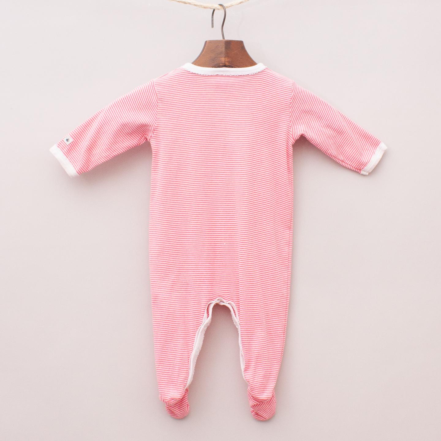 Petit Bateau pink and white striped long sleeve romper with scalloped trim, built in booties and snap button closures *100% Cotton